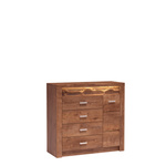 W kolekcji nie brakuje również mebli do sypialni, takich jak łóżka z opcją oświetlenia i szafki nocne, które wprowadzają spokój i elegancję do strefy wypoczynku. Dzięki wykorzystaniu trwałej płyty laminowanej meble zachowują swój doskonały wygląd przez lata, a detale – jak metalowe prowadnice i uchwyty – podkreślają ich solidność i wysoką jakość.