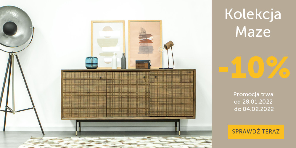Kolekcja Maze to nowoczesne meble, charakteryzujące się starannym wykonaniem zarówno prostych formą korpusów, jak i rzeźbionych frontów czy metalowych nóżek zakończonych złotym dekorem. Ponadczasowe połączenie korpusów z naturalnego drewna i czarnych nóżek sprawdzi się w aranżacji każdego wnętrza. Szeroka gama produktów pozwala na wyposażenie sypialni, jadalni, salonu czy przedpokoju nadając pomieszczeniu nowoczesny klimat z nutą stylu retro.