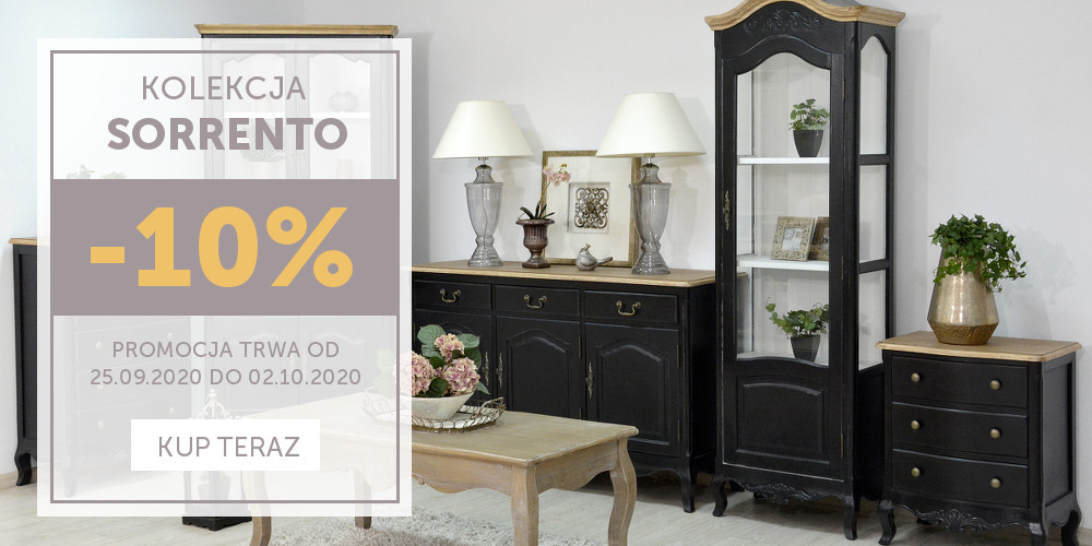 Kolekcja Sorrento to niezwykłe meble w stylu prowansalskim. Czarne połyskliwe, przecierane korpusy idealnie współgrają z jasnobrązowymi blatami i uchwytami w odcieniu starego złota. Gięte nogi, ozdobne uchwyty i rzeźbienia, zaokrąglone fronty i przede wszystkim odważny czarny kolor to cechy kolekcji Sorrento. Dominujący czarny kolor mebli przełamany jest jasnym blatem i uchwytami a także strukturą- korpusy są ręcznie malowane z widocznymi pociągnięciami pędzla, co sprawia iż każdy mebel jest niepowtarzalny. Szeroka gama produktów pozwala na aranżację jadalni, salonu, przedpokoju czy sypialni.