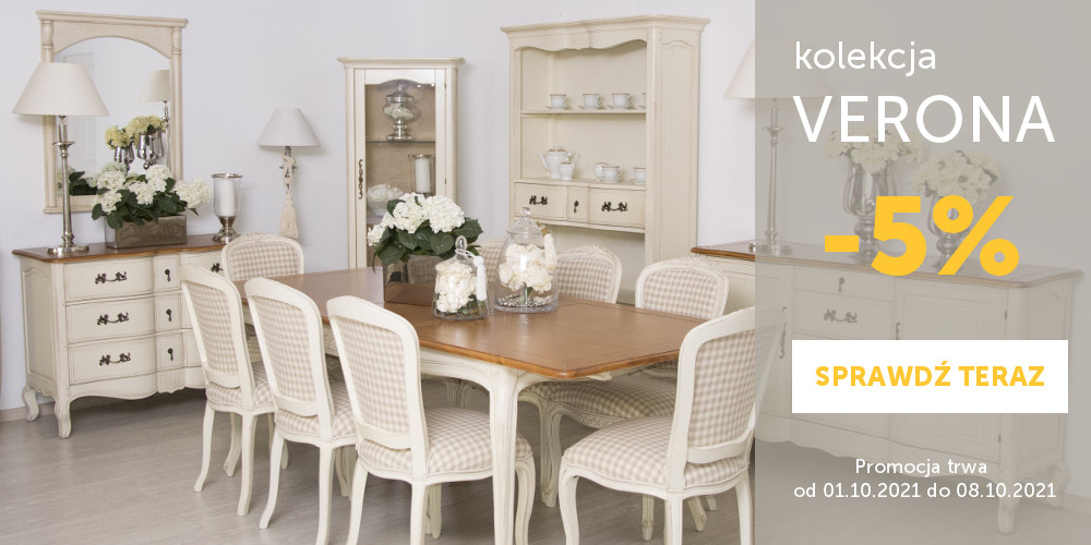 Z najwyższą przyjemnością prezentujemy Państwu piękne stylowe meble we francuskim stylu - kolekcję VERONA. Charakterystyczne detale w postaci pięknych okuć i rzeźbień, ozdobne ćwieki oraz powierzchnia łącząca charakterystyczne postarzenia w stylu shabby chic z perfekcyjnie wykończoną politurą stanowią o bogatym, niepowtarzalnym pięknie tych mebli.Całości dopełnia połączenie stonowanych aczkolwiek wyrazistych kolorów – miodowych blatów z kremowymi korpusami. VERONA jest wykonana z naturalnych materiałów, ze szczególną dbałością o najdrobniejsze detale. Ekskluzywny charakter mebli podkreślają też delikatne tkaniny użyte do wyścielenia szuflad.