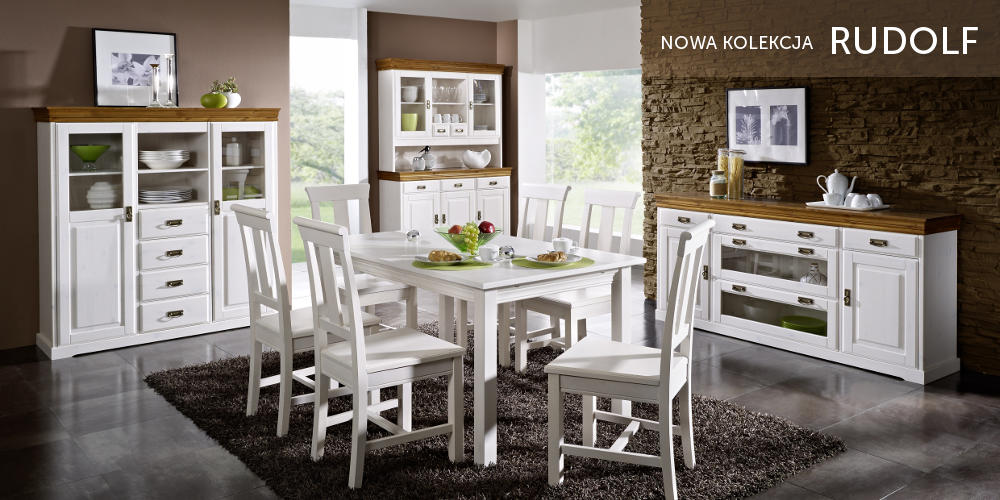 Kolekcja Rudolf to klasyczne meble wykonane z drewna sosnowego pokrytego białym woskiem. Wieńce w kolorze miodowym tworzą piękny kontrast do białych korpusów. Proste kształty, uchwyty oraz frezowane fronty tworzą spokojny klimat w jadalni. W kolekcji znajdują się komody, kredensy, witryny, szafy a także stół z krzesłami. Meble idealne dla każdego, kto ceni funkcjonalność oraz klasyczne wykonanie. Zapraszamy do obejrzenia naszych nowych produktów z kolekcji Rudolf.