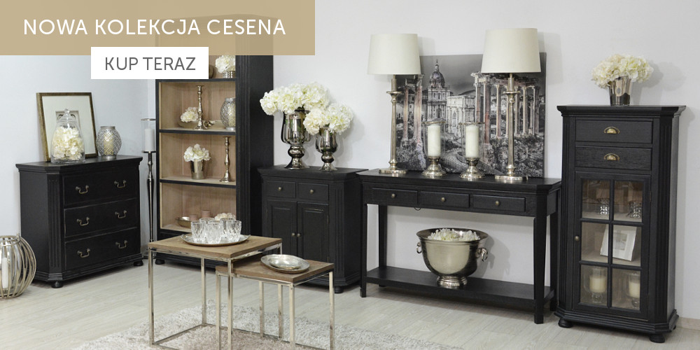 Kolekcja Cesena to eleganckie, proste czarne meble w stylu klasycznym. Połyskliwe czarne korpusy z widoczną strukturą drewna połączone zostały z uchwytami w kolorze starego złota. Frezowane krawędzie, przetarcia i półokrągłe nóżki nadają formie niebanalnego wyglądu. Stylowe meble z kolekcji Cesena sprawdzą się z aranżacji każdego pomieszczenia.