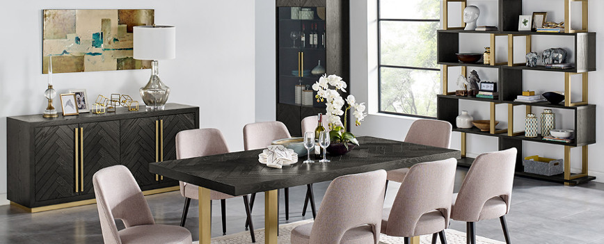 Meble wykonane z drewna białego dębu w kolorze czarnym z nóżkami w kolorze złotym. Charakterystyczne dla kolekcji są blaty z intarsją.