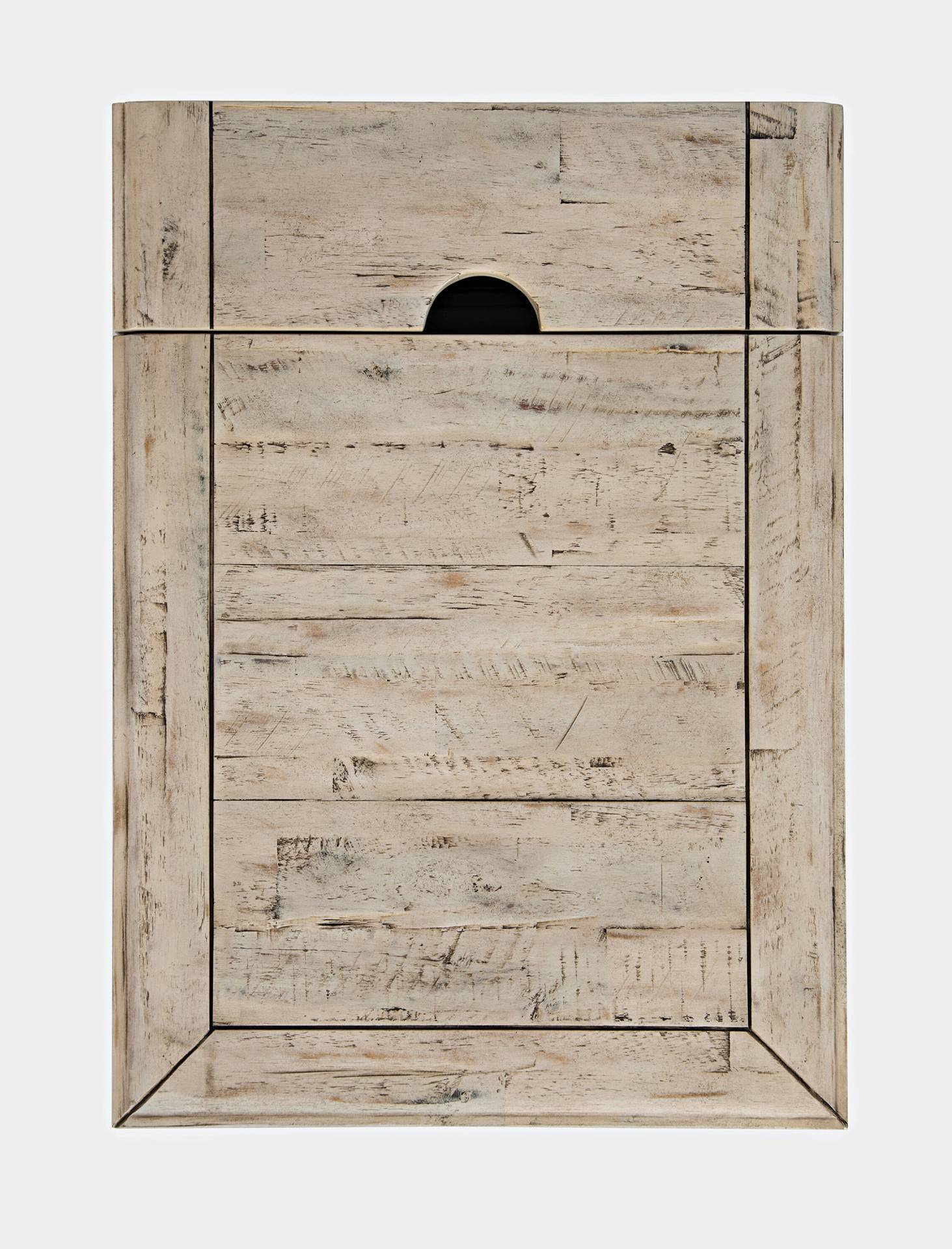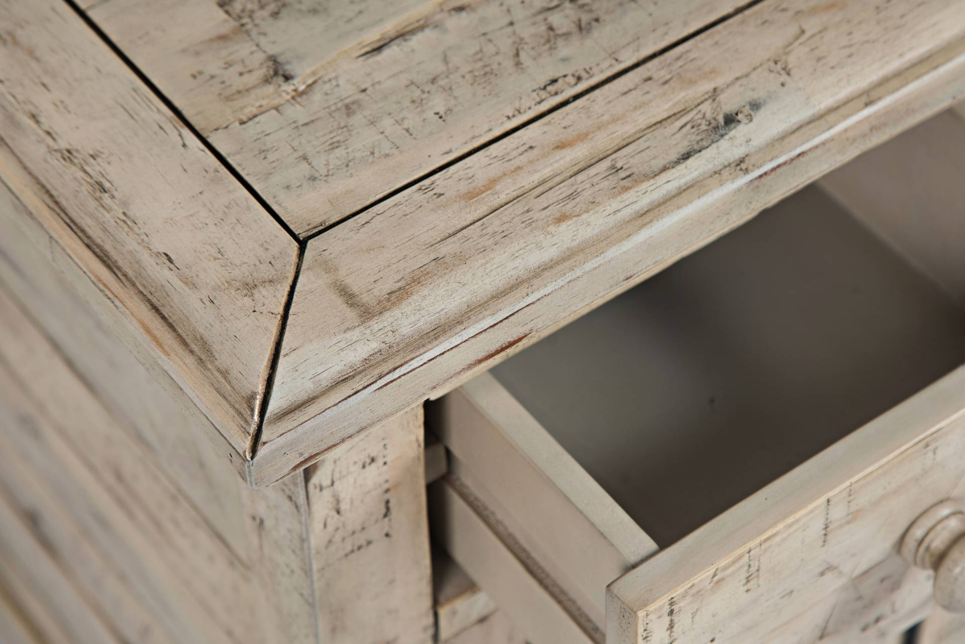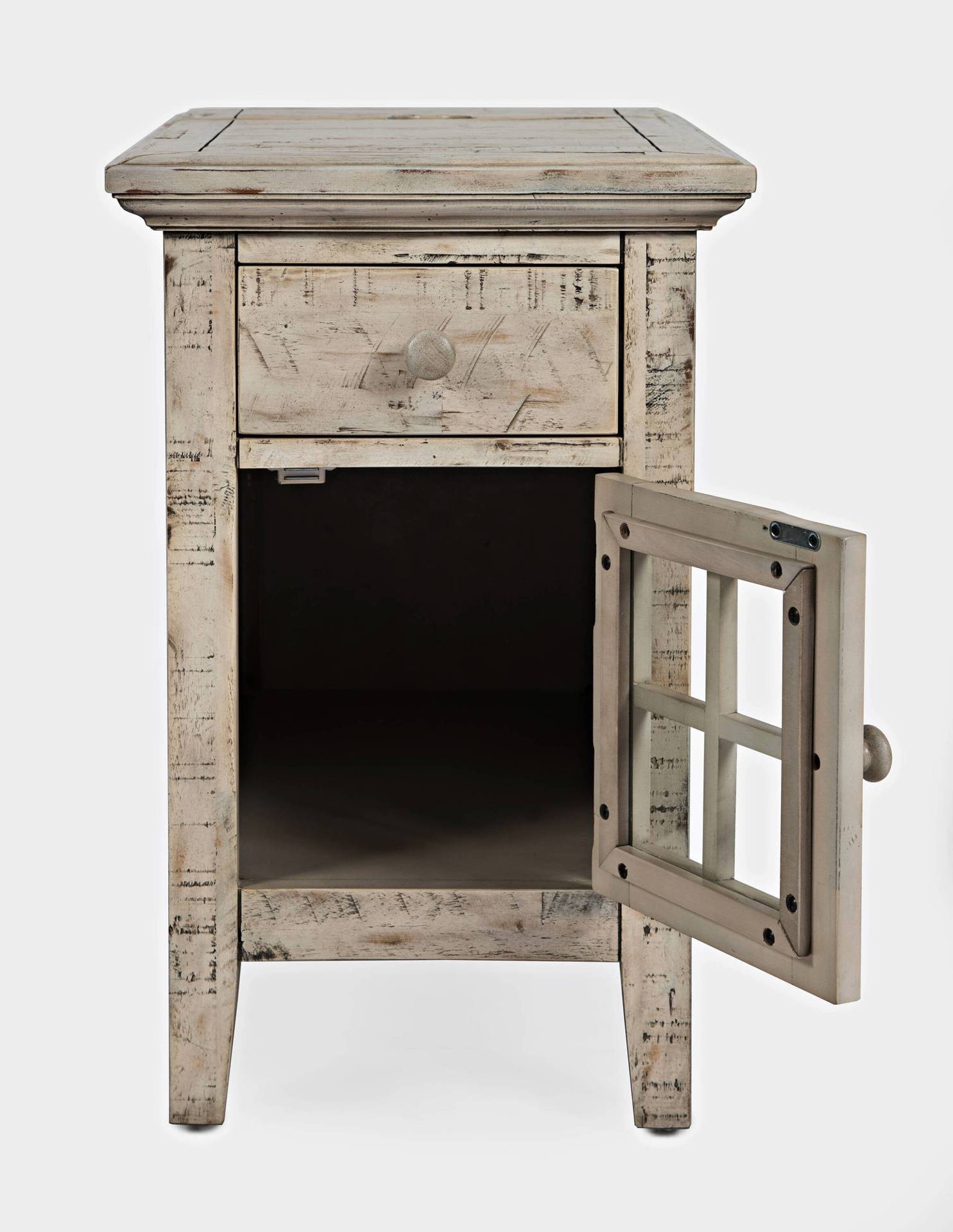- Szafka nocna z jednymi drzwiczkami i jedną półką wykonana z drewna akacji w kolorze kości słoniowej. Wbudowane gniazdo i wejście USB.