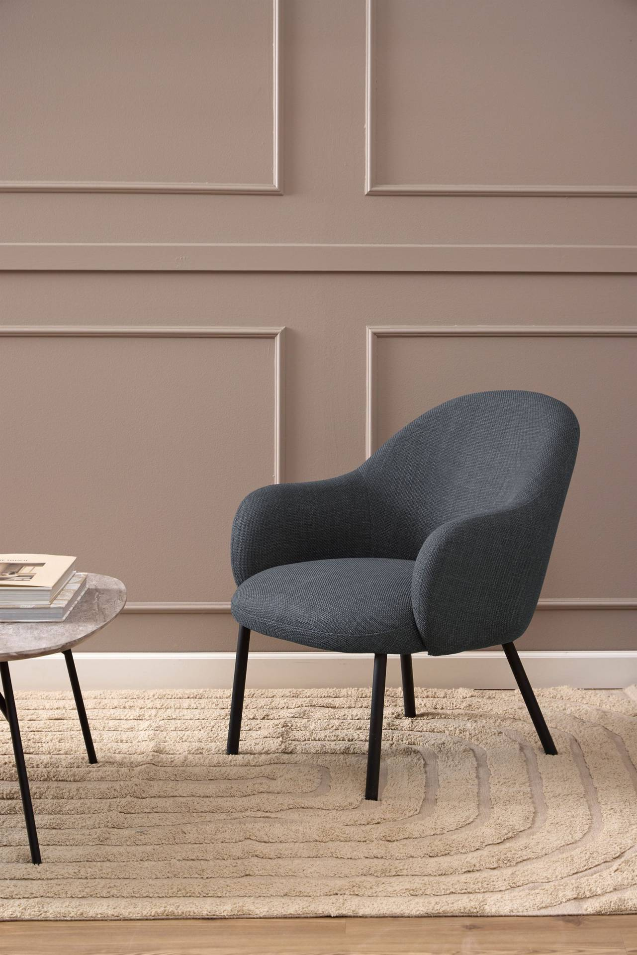 - Fotel Spencer od Actona to elegancki mebel o zaokrąglonym kształcie, tapicerowany ciemnoszarym materiałem o dwukolorowym efekcie. Stabilne, okrągłe nogi ze stali w czarnym matowym wykończeniu dodają mu nowoczesnego charakteru. Idealny do każdego wnętrza!