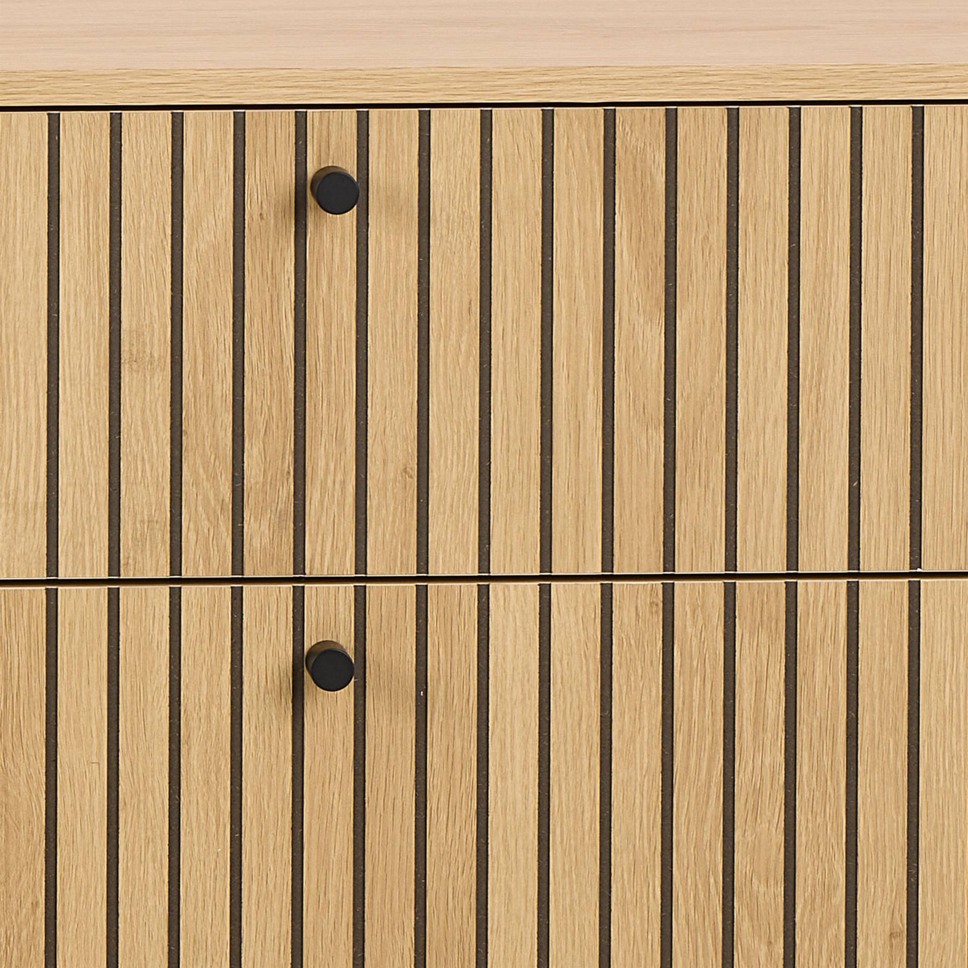 Komoda Actona Albany łączy elegancki wygląd dębu naturalnego z nowoczesnym designem i czarnymi akcentami. Posiada 6 pojemnych szuflad, zapewniając praktyczne rozwiązanie do przechowywania. Łatwa w pielęgnacji powierzchnia oraz stalowe nogi dodają stylu.