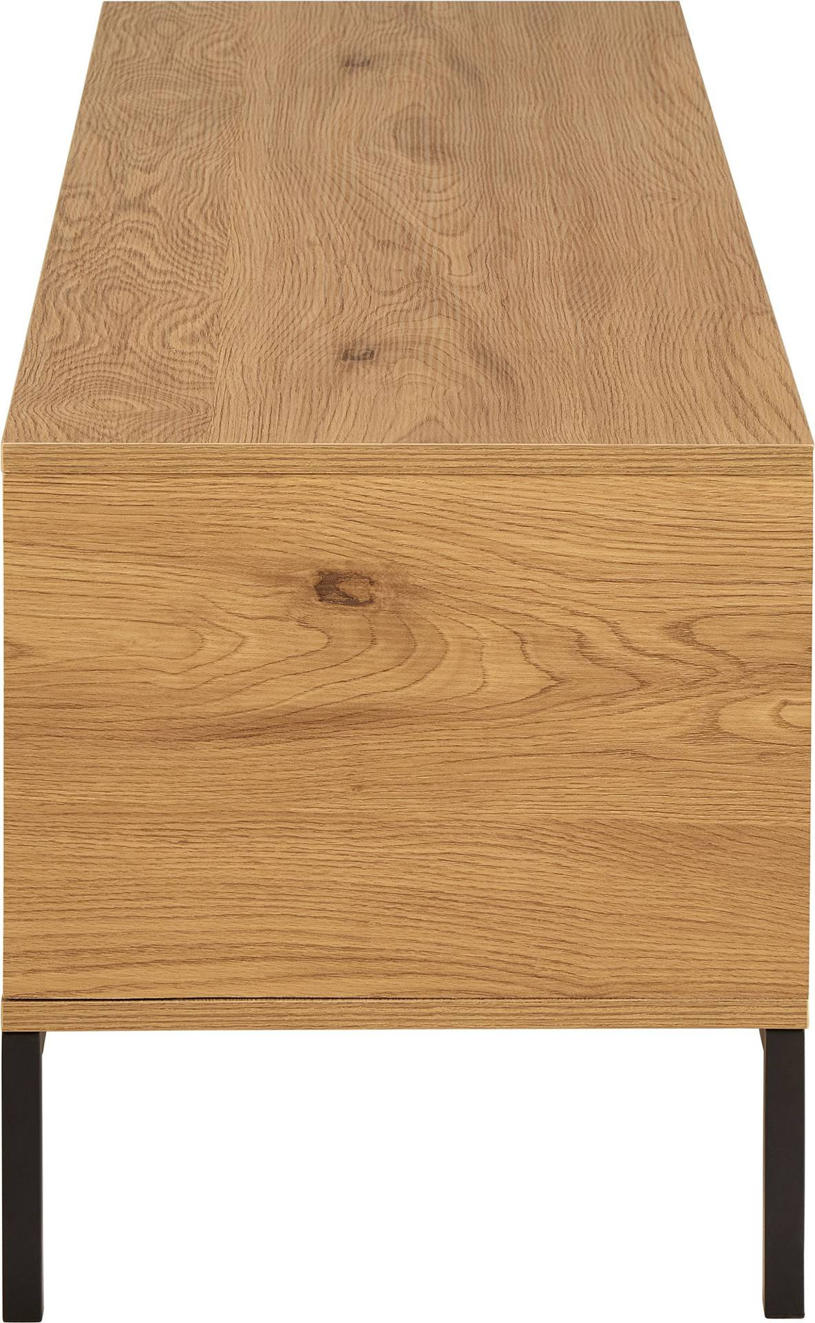 Komoda RTV Seaford od Actona to elegancki mebel w stylu skandynawskim. Wykonana z płyty MDF w dekorze dębu dzikiego, oferuje praktyczne przechowywanie dzięki dwóm drzwiom i szufladzie. Czarne stalowe nogi i system push-to-open nadają jej charakter.