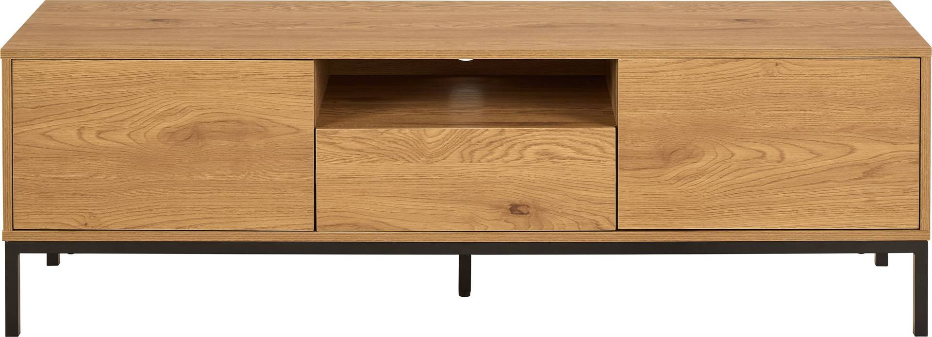 - Komoda RTV Seaford od Actona to elegancki mebel w stylu skandynawskim. Wykonana z płyty MDF w dekorze dębu dzikiego, oferuje praktyczne przechowywanie dzięki dwóm drzwiom i szufladzie. Czarne stalowe nogi i system push-to-open nadają jej charakter.