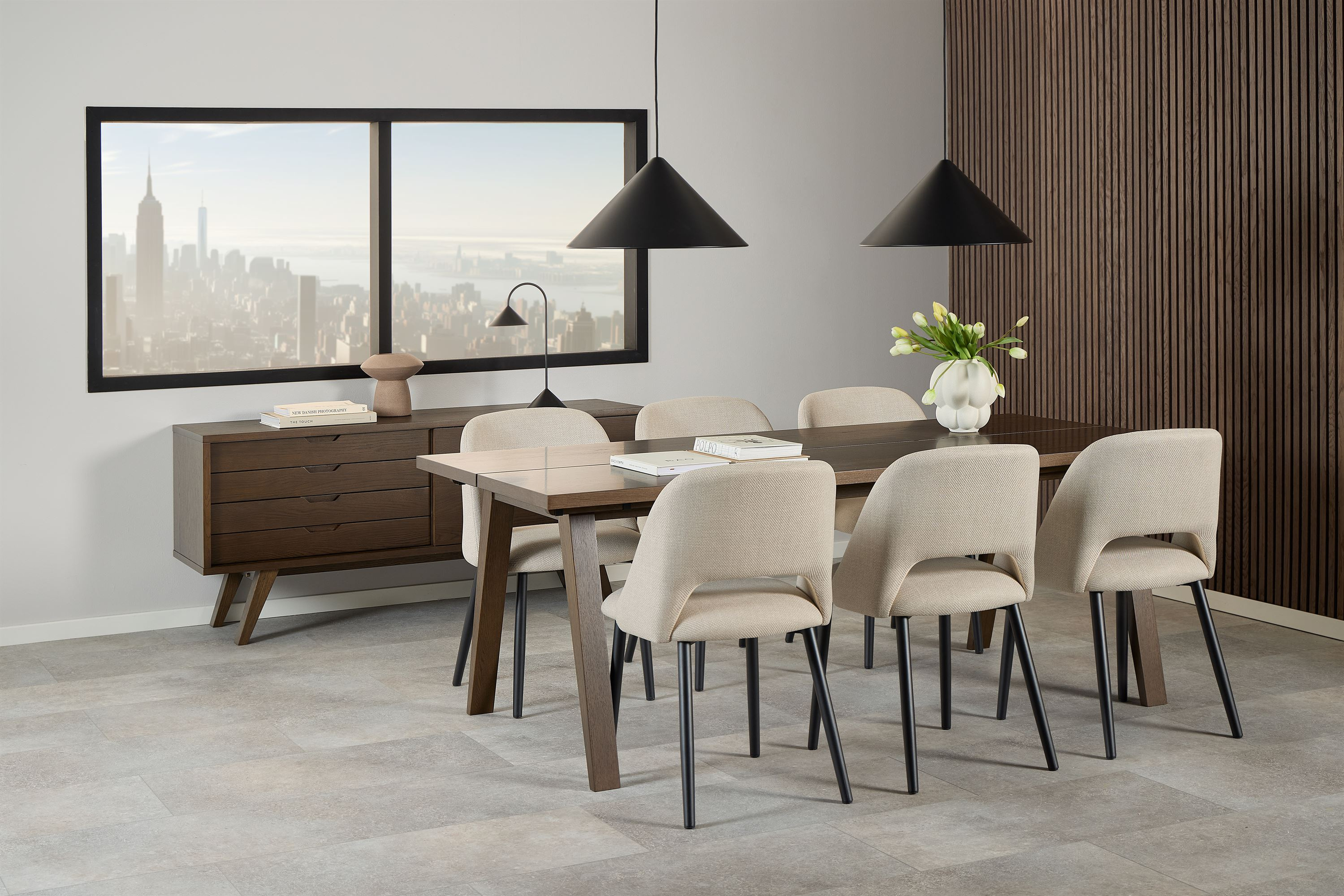 Stół jadalniany A-Line od marki Actona łączy nowoczesny styl skandynawski z klasycznym designem. Dąb dymiony oraz prostokątny blat nadają mu elegancji. Kątowe nogi dodają stabilności. Idealny dla 6 osób, z możliwością przedłużenia.