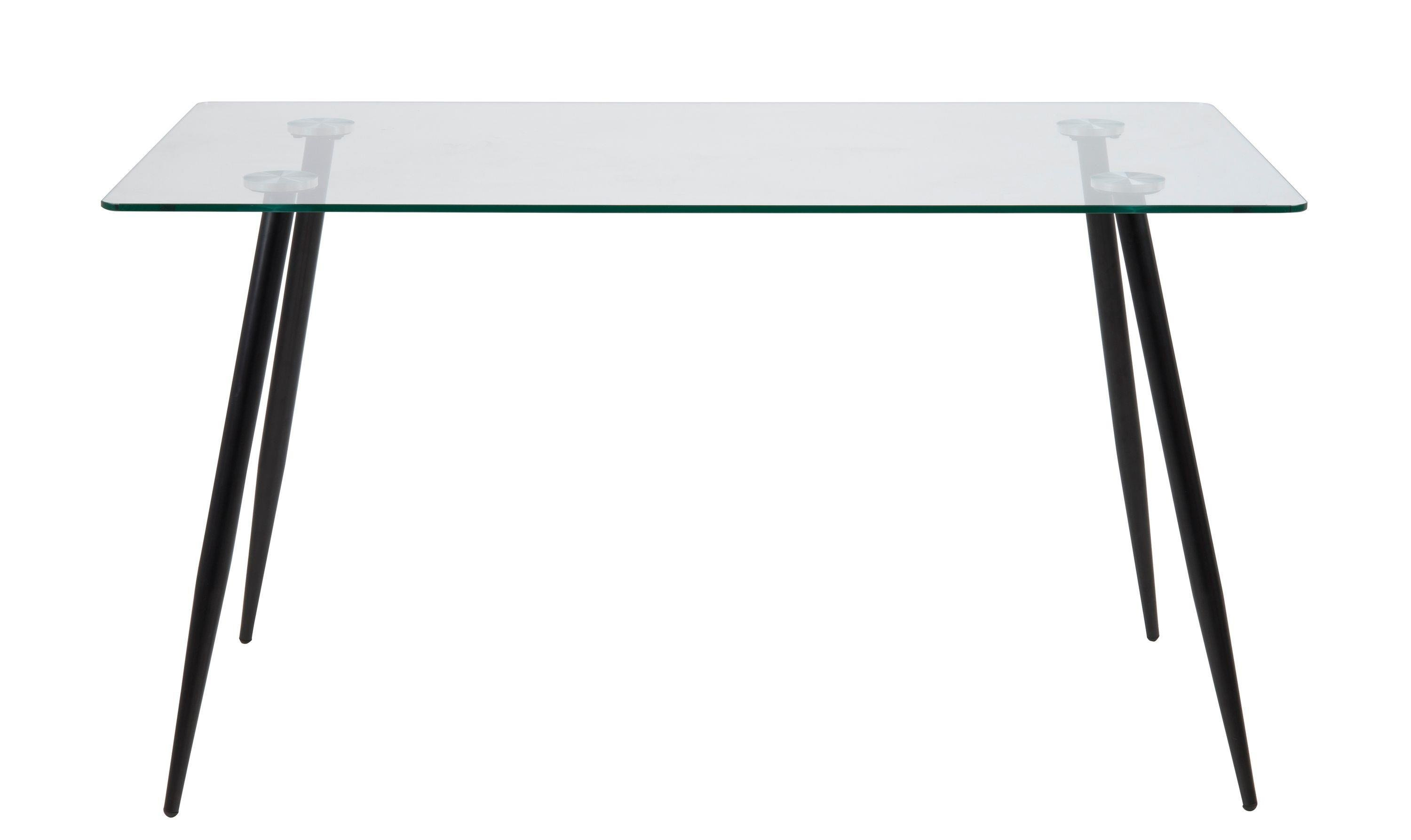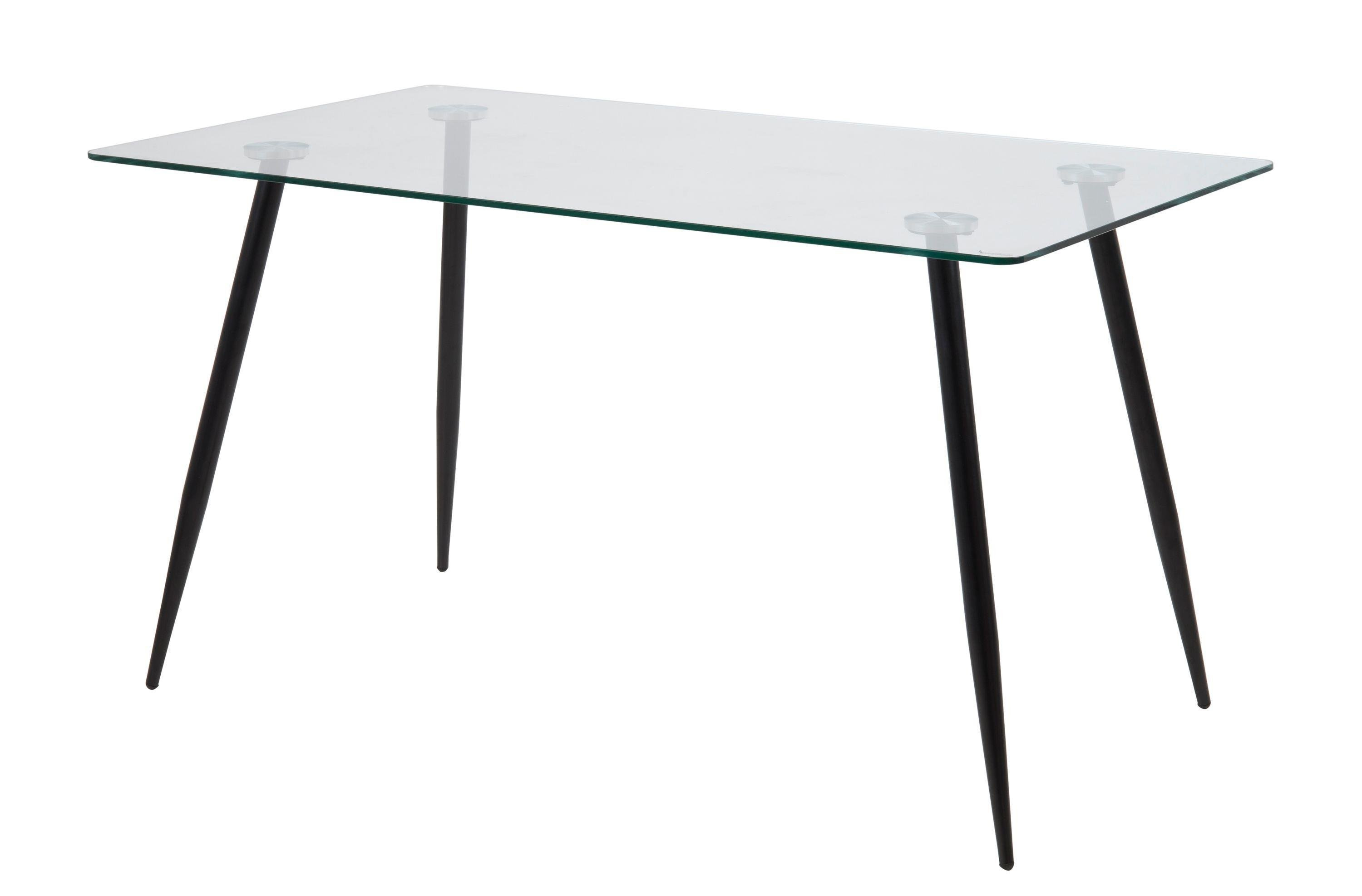 • Stylowy stół jadalniany Wilma z prostokątnym szklanym blatem ustawionym na metalowych nóżkach.