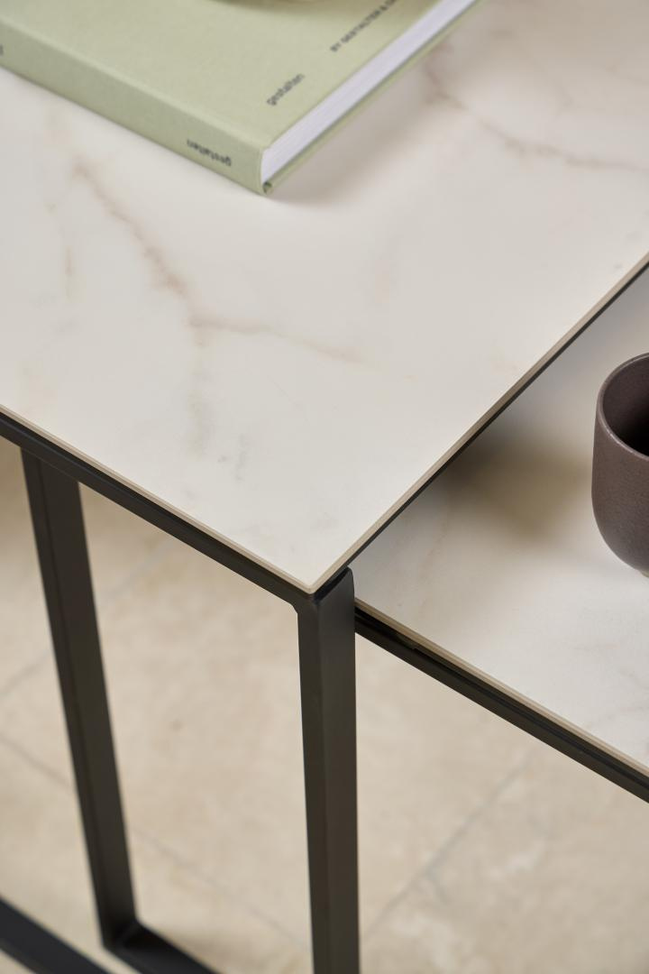 Podstawa stolika wykonana z czarnej, matowej stali dodaje mu nowoczesnego charakteru, a jednocześnie zapewnia stabilność i trwałość. Konstrukcja prezentuje się lekko i elegancko, a także doskonale współgra z innymi elementami wystroju wnętrza. To połączenie bieli i czerni sprawia, że stolik doskonale wpisuje się w zarówno klasyczne, jak i nowoczesne aranżacje.