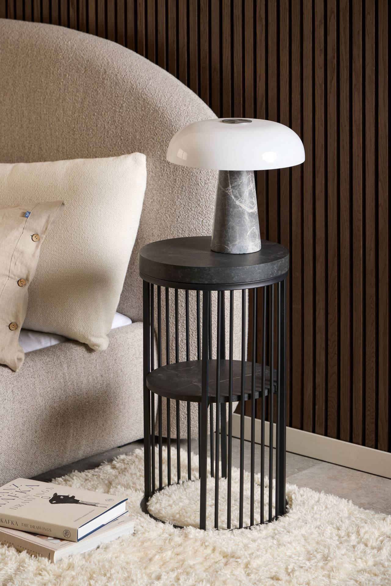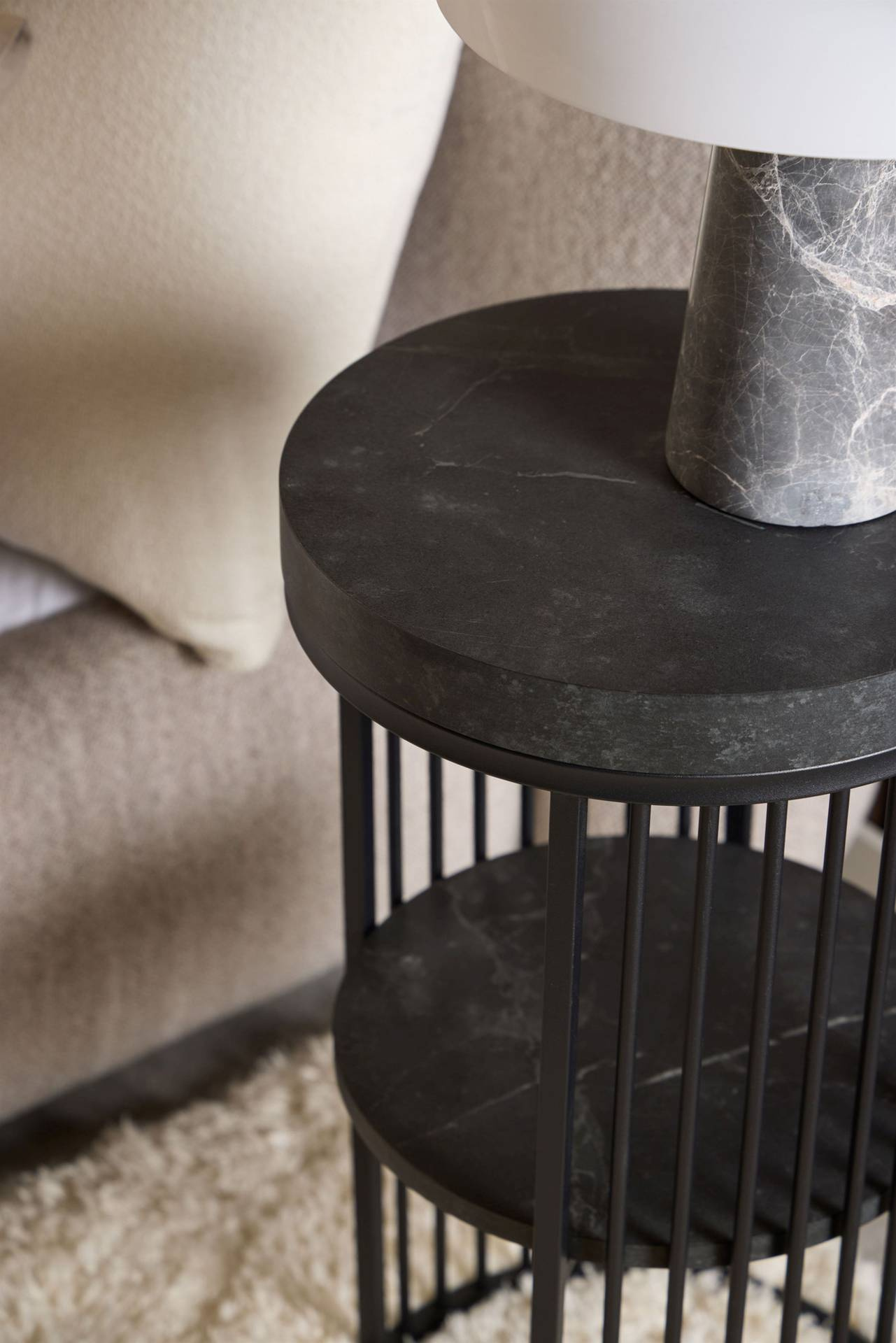 Blat oraz półki tego stolika zostały wykonane z płyty laminowanej o wyglądzie czarnego marmuru, co dodaje mu luksusowego charakteru. Połączenie czarnej matowej powierzchni z delikatnymi, pionowymi prętami wykonanymi z stalowego, proszkowanego metalu, sprawia, że stolik ten jest nie tylko estetyczny, ale również solidny i trwały. Jego smukła konstrukcja wydaje się lekka, a jednocześnie zapewnia stabilność i wszechstronność w codziennym użytkowaniu.