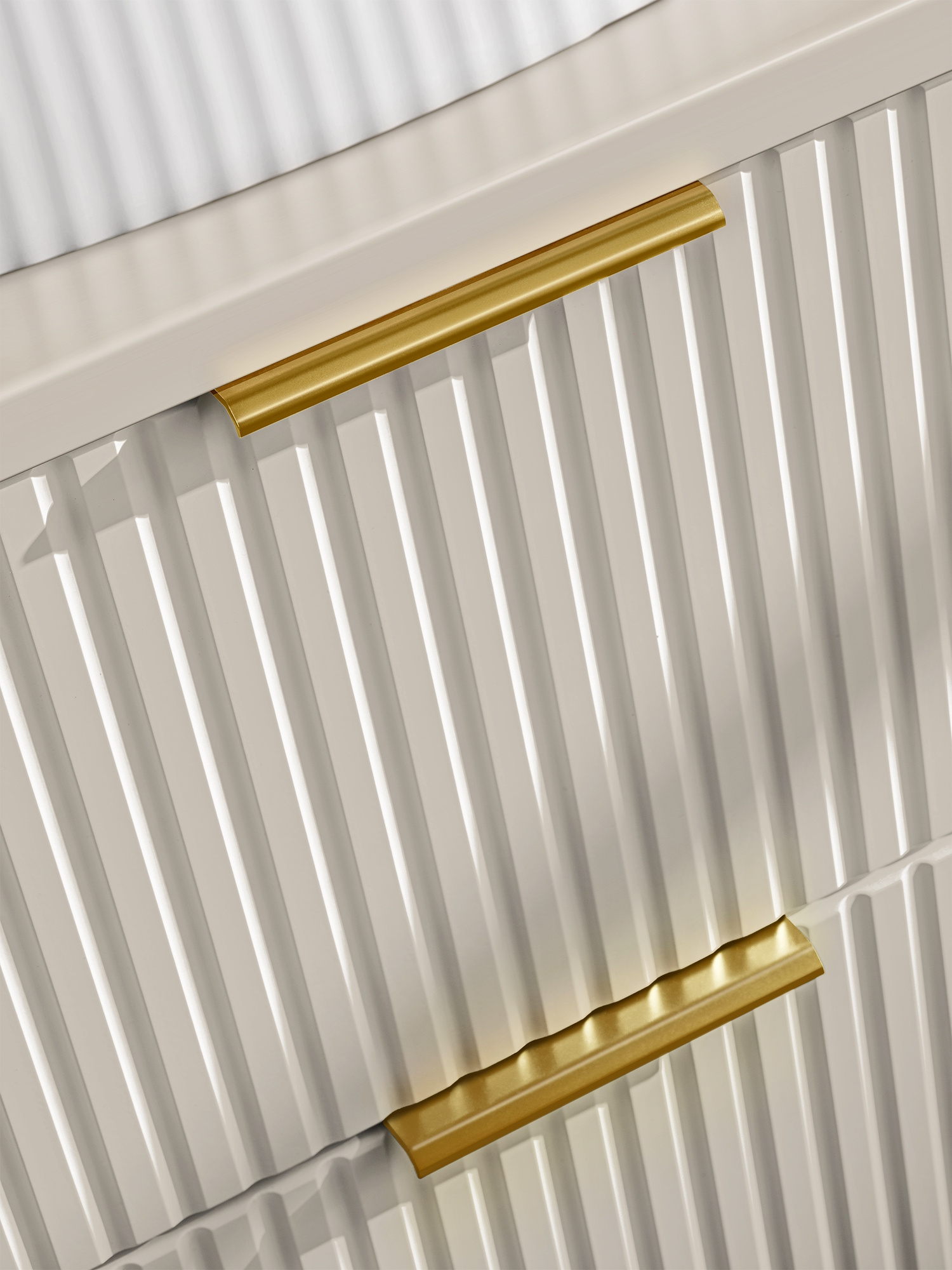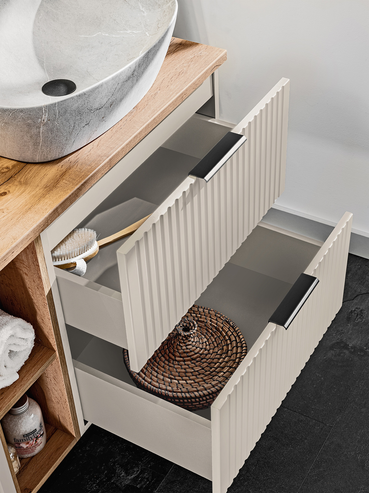 Szafka została zaprojektowana z myślą o codziennym użytkowaniu. Dwie przestronne szuflady oferują wystarczająco dużo miejsca na wszystkie niezbędne akcesoria łazienkowe, a dzięki frezowanym ryflom pionowym frontów, całość nabiera nowoczesnego, a zarazem przytulnego charakteru. Niezależnie od stylu Twojej łazienki, ADEL CASHMERE harmonijnie wkomponuje się w każde wnętrze, stając się jego ozdobą.