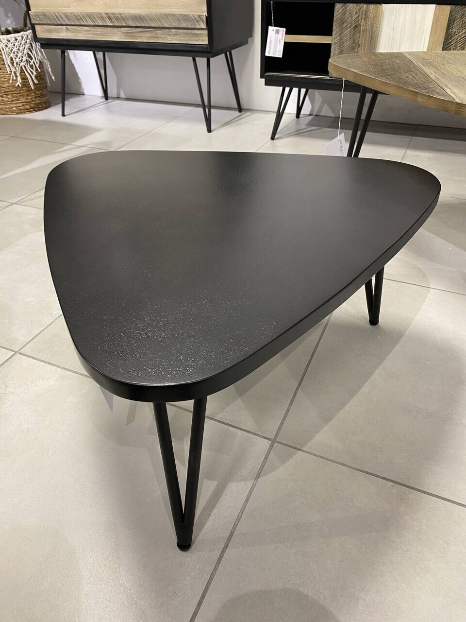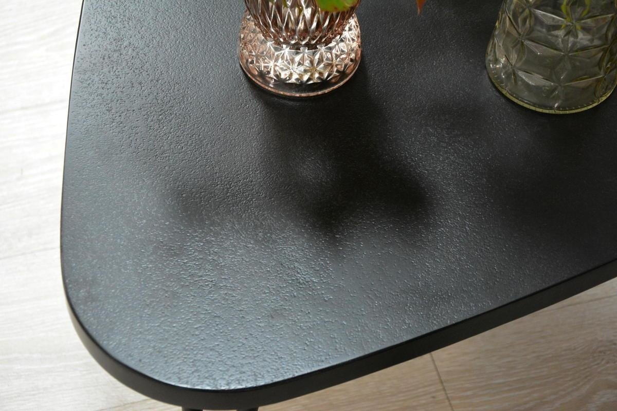Niecodzienna forma, delikatna konstrukcja i ciekawy kształt blatu w kolorze głębokiej czerni przykuwają wzrok. Powierzchnia blatu stylizowana jest na strukturę kamienia pomalowana półmatowym lakierem. Trzy stożkowe nogi wykonane z metalu w kolorze czarnym podkreślają nowoczesny design stolika.