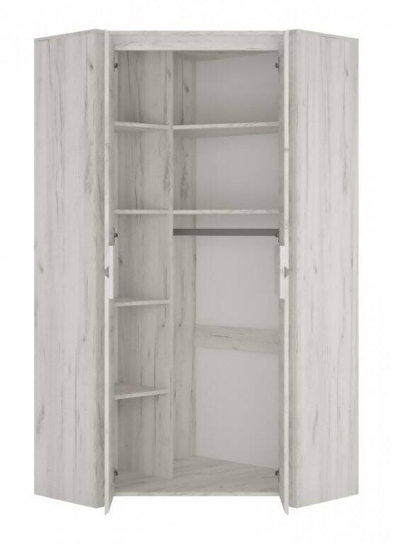 - Szafa narożna Angel TYP-21 optymalizuje przestrzeń dzięki rozmieszczeniu w kącie. Wykonana z odpornej laminowanej płyty, oferuje praktyczną organizację z systemem bezuchwytowym.