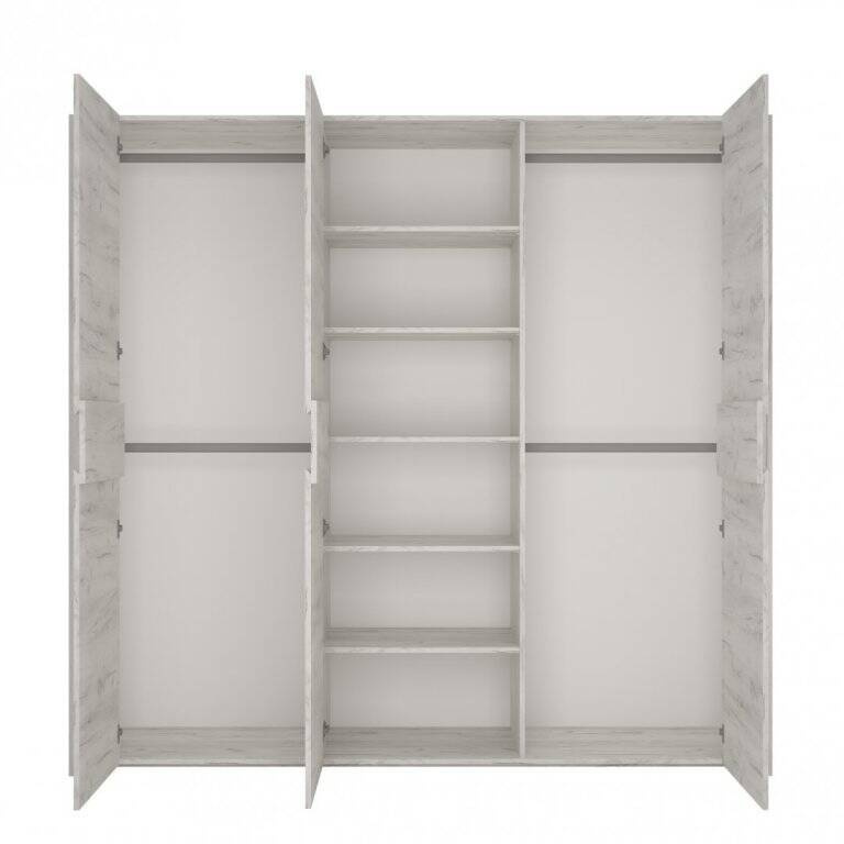 Wnętrze szafy zostało zaprojektowane z myślą o maksymalnym wykorzystaniu dostępnej przestrzeni. Cztery drążki na ubrania umożliwiają łatwe rozmieszczenie garderoby w zależności od rodzaju i rozmiaru, a pięć półek oferuje dodatkowe miejsce do przechowywania innych przedmiotów, takich jak akcesoria, pościel czy ręczniki.