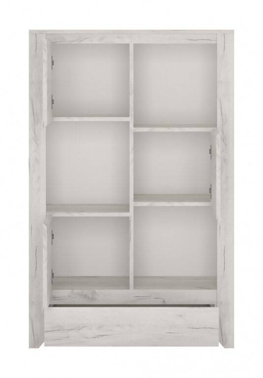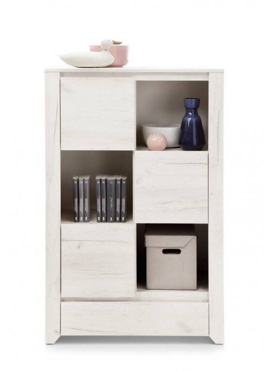 Angel TYP-31 wyposażona jest w trzy otwarte półki, które są idealnym miejscem do eksponowania dekoracji, takich jak książki, ramki ze zdjęciami czy ulubione zabawki dziecka. Można je również wykorzystać, umieszczając w nich eleganckie koszyki, które pomogą zachować porządek i zorganizować drobne przedmioty. Dodatkowo, trzy przestronne półki schowane są za frontami, oferując dyskretną przestrzeń do przechowywania, a praktyczna, wysuwana szuflada idealnie nadaje się do układania mniejszych akcesoriów.
