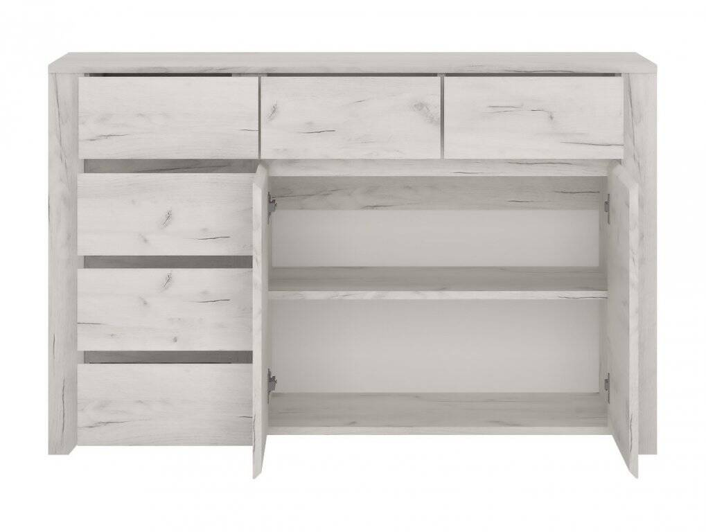 Zewnętrzne wymiary komody Angel TYP-42 to: szerokość 118,7 cm, wysokość 76,5 cm oraz głębokość 40,2 cm, co czyni ją nie tylko kompaktową, ale również wyjątkowo pojemną. Wykonana z wysokiej jakości płyty laminowanej w bieli, wprowadza do pomieszczenia uczucie spokoju i harmonii. Delikatne wybarwienie naturalne wpisuje się zarówno w biel, jak i inne palety kolorów panujące w Twoim mieszkaniu, tworząc spójną i przyjazną atmosferę.