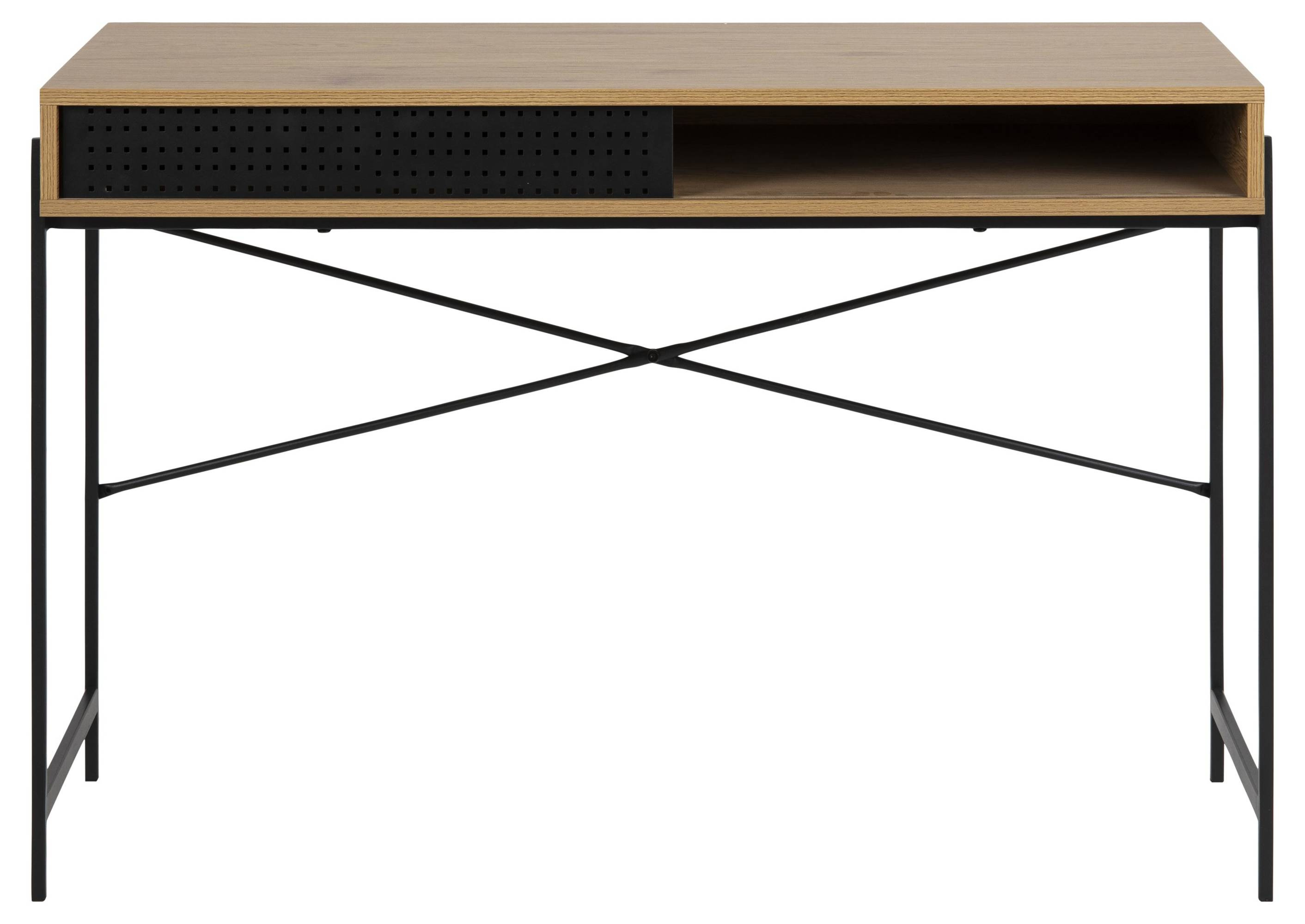 Prostokątne biurko Angus, matowy dąb dziki szorstki papier, podstawa czarny matowy szorstki metal malowany proszkowo, z metalową siatką, otwartą komorą i drzwiami przesuwnymi, 110x50x75 cm