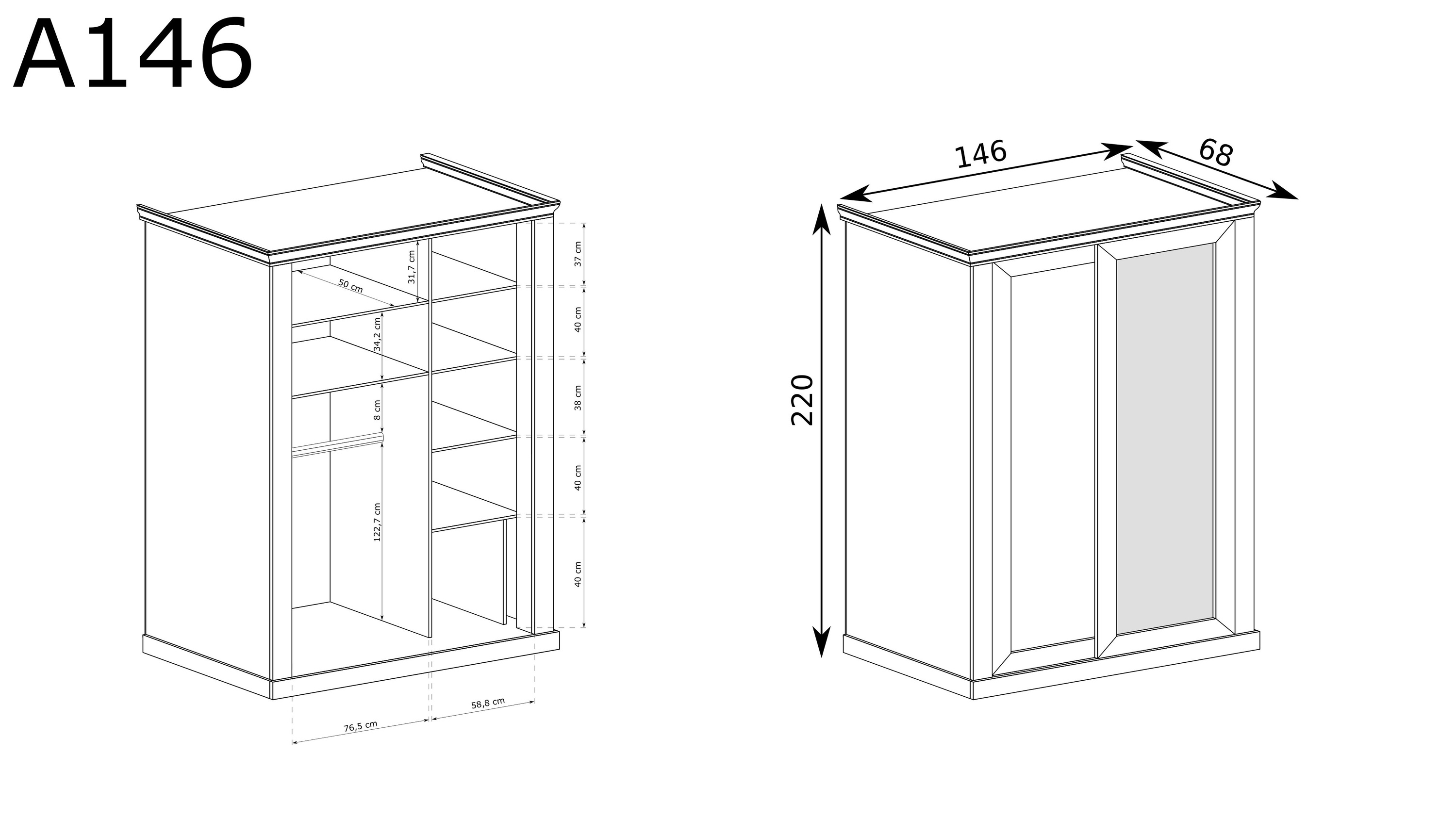 Dzięki swojemu uniwersalnemu designowi, szafa Antica-146 świetnie odnajdzie się w sypialni, przedpokoju czy salonie. Możesz swobodnie planować aranżacje wnętrza, łącząc ją z innymi elementami wyposażenia. Jej styl nawiązuje do klasycznych rozwiązań, a jednocześnie wprowadza nutę nowoczesności, co sprawia, że jest idealną propozycją dla osób, które cenią sobie elegancki, ale nieprzesadny wystrój.