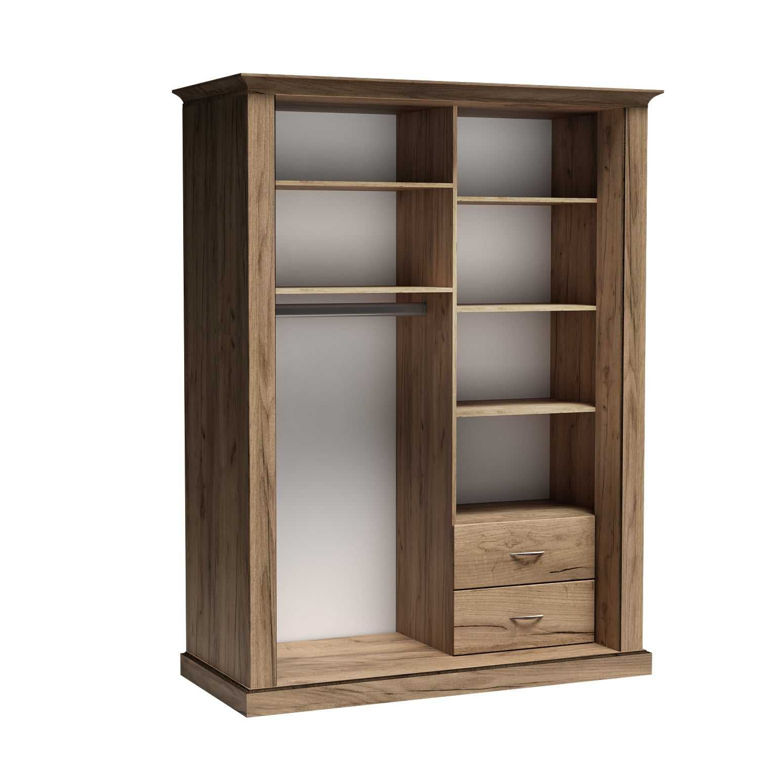 Szafa Antica-146 to elegancki mebel z dwiema przesuwnymi drzwiami, w tym jednym z lustrem, oraz dwiema szufladami i pięcioma półkami. Wykonana z laminowanej płyty w kolorze Kraft Złoty, idealnie uzupełni sypialnię, przedpokój lub salon.