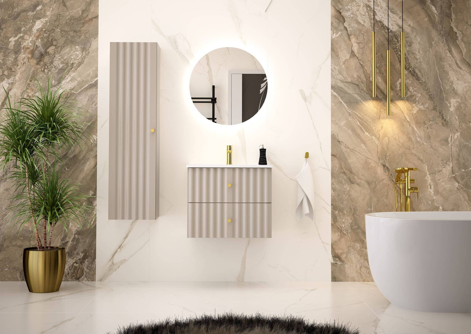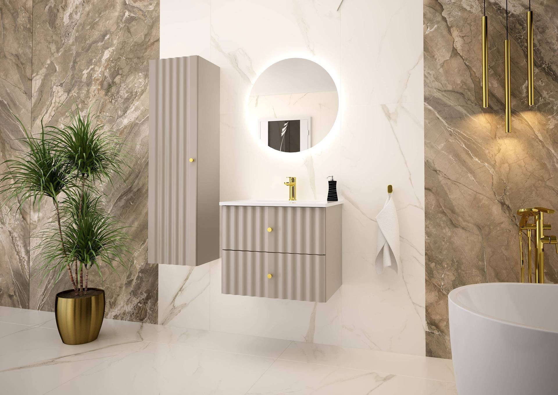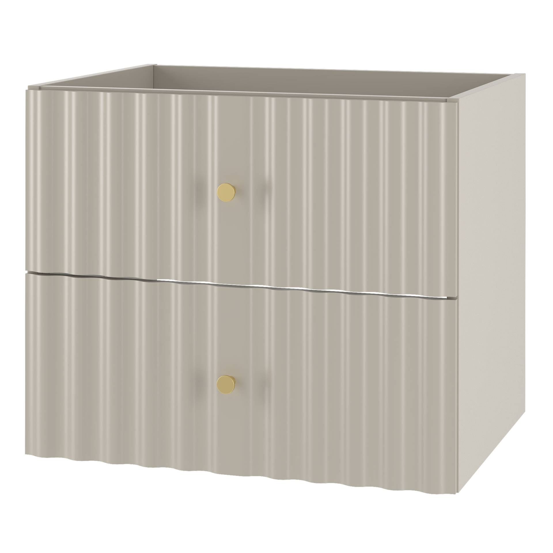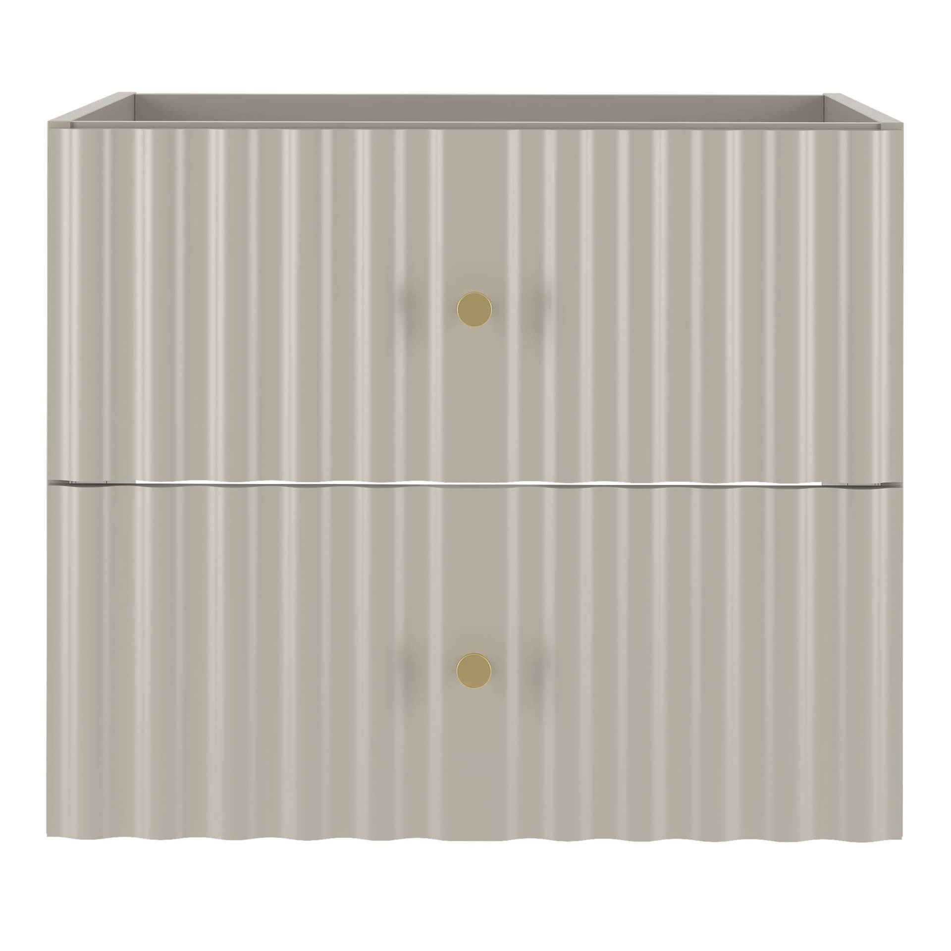 Szafka pod umywalkę AQUA-02 Megstyl to elegancja i funkcjonalność w jednym. Wykonana z odpornej płyty MDF i laminowanej, w kaszmirowym kolorze wzbogaconym o uchwyty w szczotkowanym złocie. Wyposażona w ciche prowadnice, idealna do nowoczesnych łazienek.