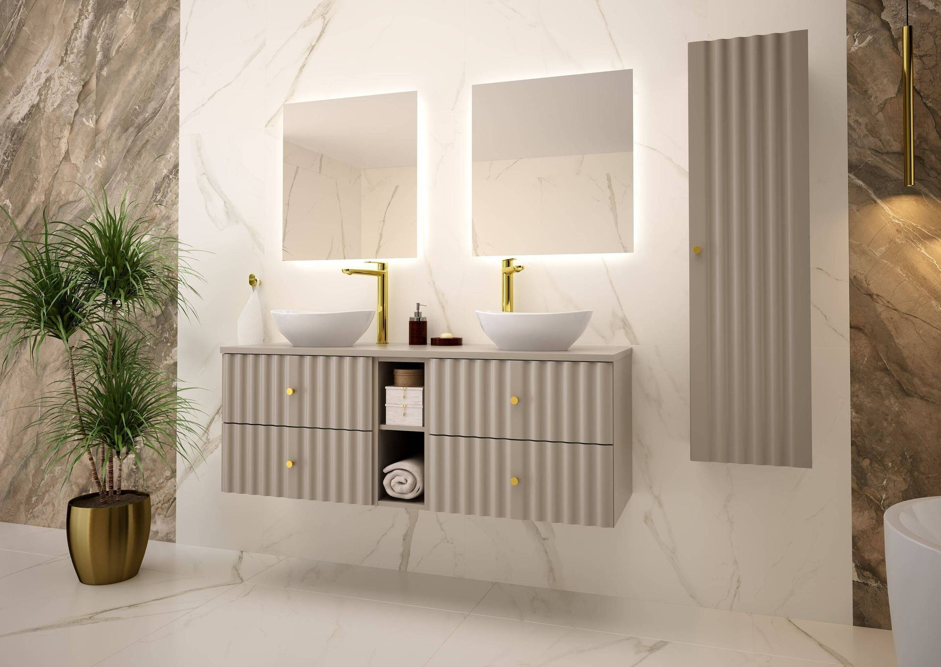 - Elegancka szafka pod umywalkę marki Megstyl z blatem i regałem 4S w kolorze kaszmir. Wykonana z MDF i laminowanej płyty, oferuje cichy domyk. Złote uchwyty dodają luksusu. Idealna do stylowych łazienek, inspiruje nowoczesnym designem.
