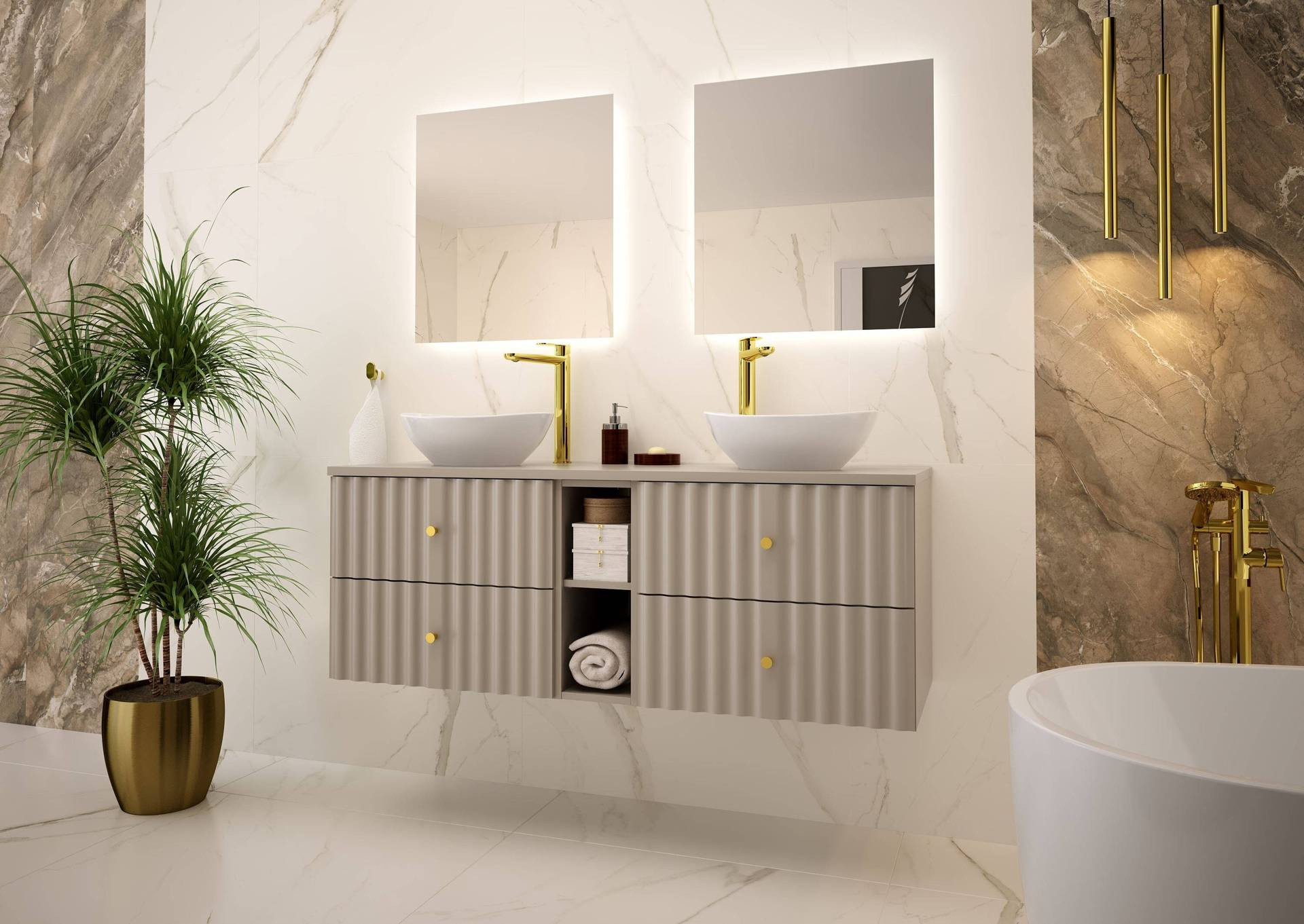 Elegancja i funkcjonalność łączą się tutaj w harmonijną całość, a kaszmirowy blat dodaje szlachetności i luksusowego akcentu. Dzięki zastosowaniu metalowych uchwytów w kolorze szczotkowanego złota, szafka nabiera wyjątkowego wyrazu, stając się nie tylko praktycznym, ale i dekoracyjnym elementem wnętrza. Cichy domyk szuflad zapewnia komfort użytkowania i podnosi codzienną wygodę.