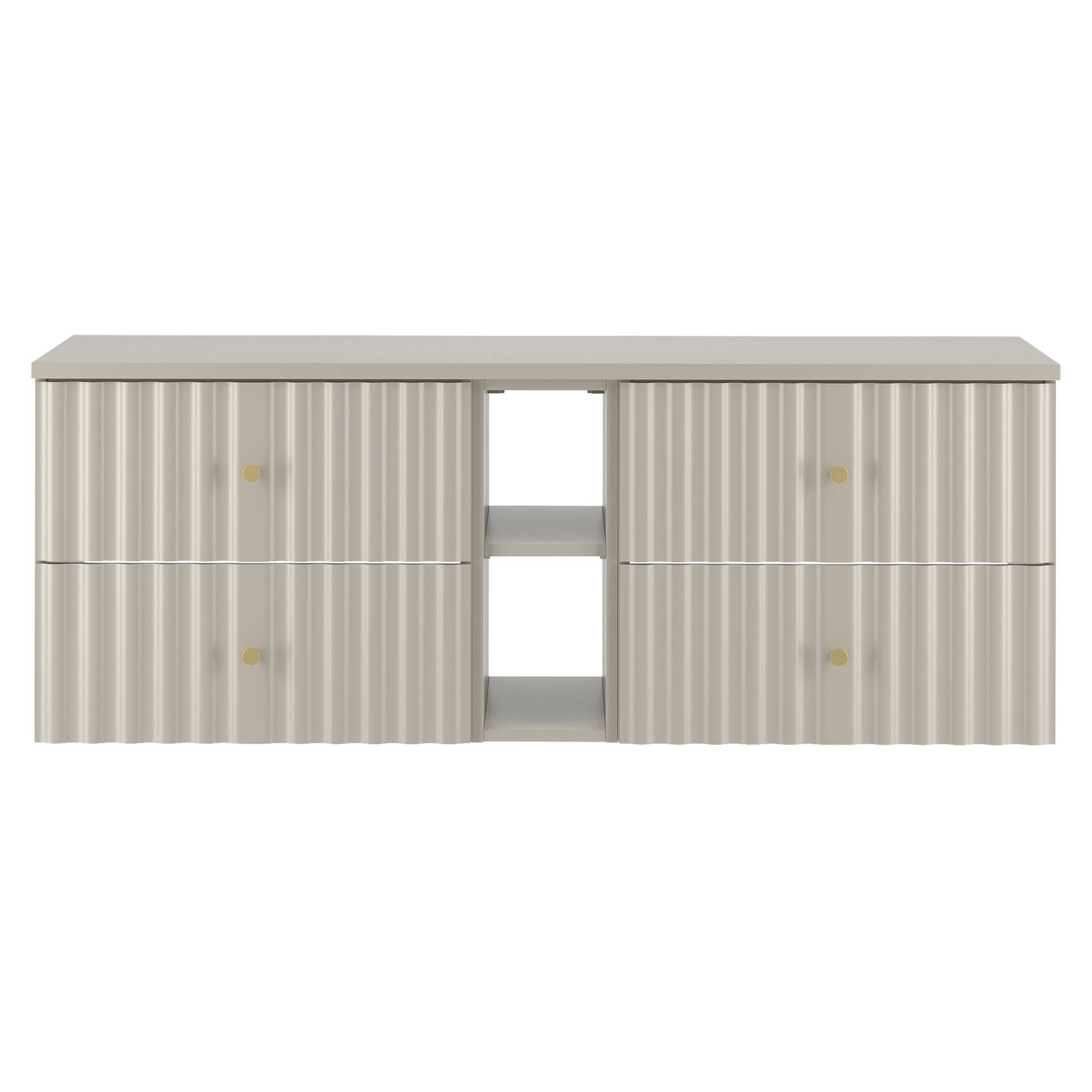 Elegancka szafka pod umywalkę marki Megstyl z blatem i regałem 4S w kolorze kaszmir. Wykonana z MDF i laminowanej płyty, oferuje cichy domyk. Złote uchwyty dodają luksusu. Idealna do stylowych łazienek, inspiruje nowoczesnym designem.