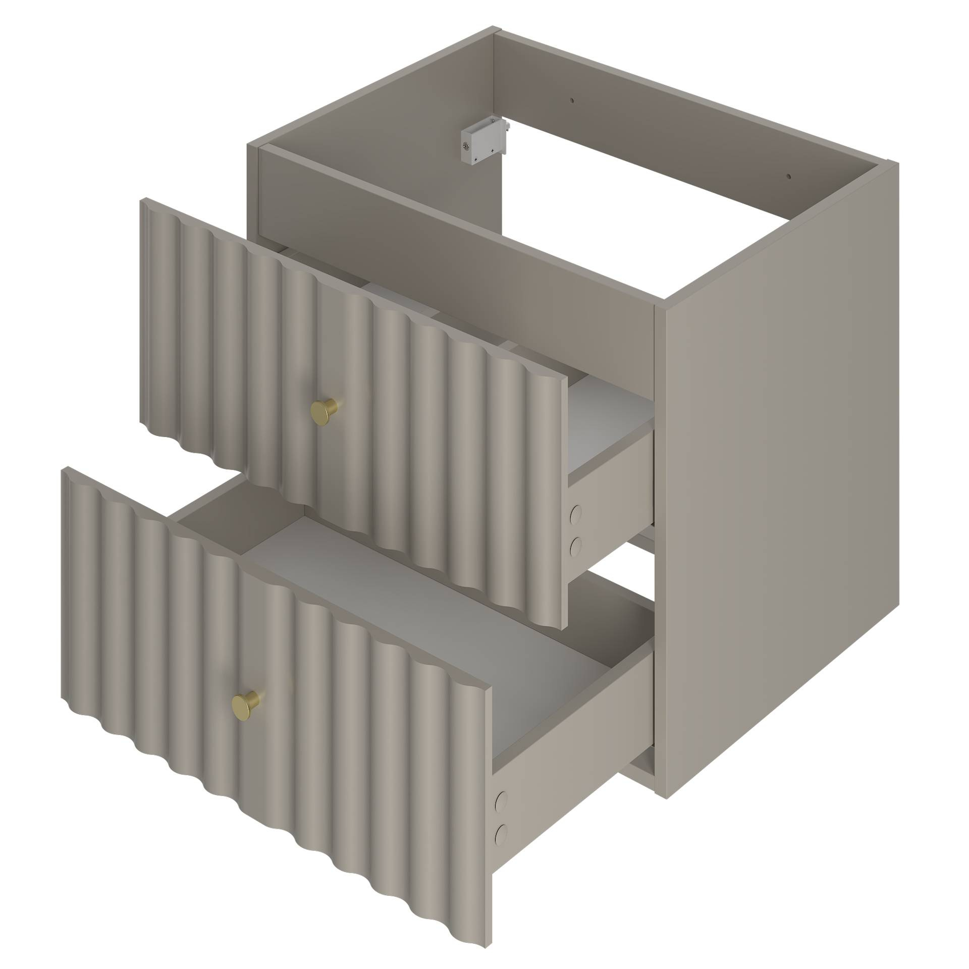 Dzięki kompaktowym wymiarom 60 cm szerokości, szafka z umywalką doskonale sprawdzi się nawet w mniejszych przestrzeniach, jednocześnie zapewniając wygodne użytkowanie. Wyjątkowy charakter tej szafki podkreśla subtelne wykończenie w kolorze szczotkowanego złota, które kontrastuje z delikatnym odcieniem kaszmiru, dodając całości nowoczesnego sznytu. Rozwiązanie to sprawia, że prostota i elegancja idą w parze, czyniąc Twoją łazienkę miejscem, gdzie można naprawdę odpowiednio się zrelaksować.