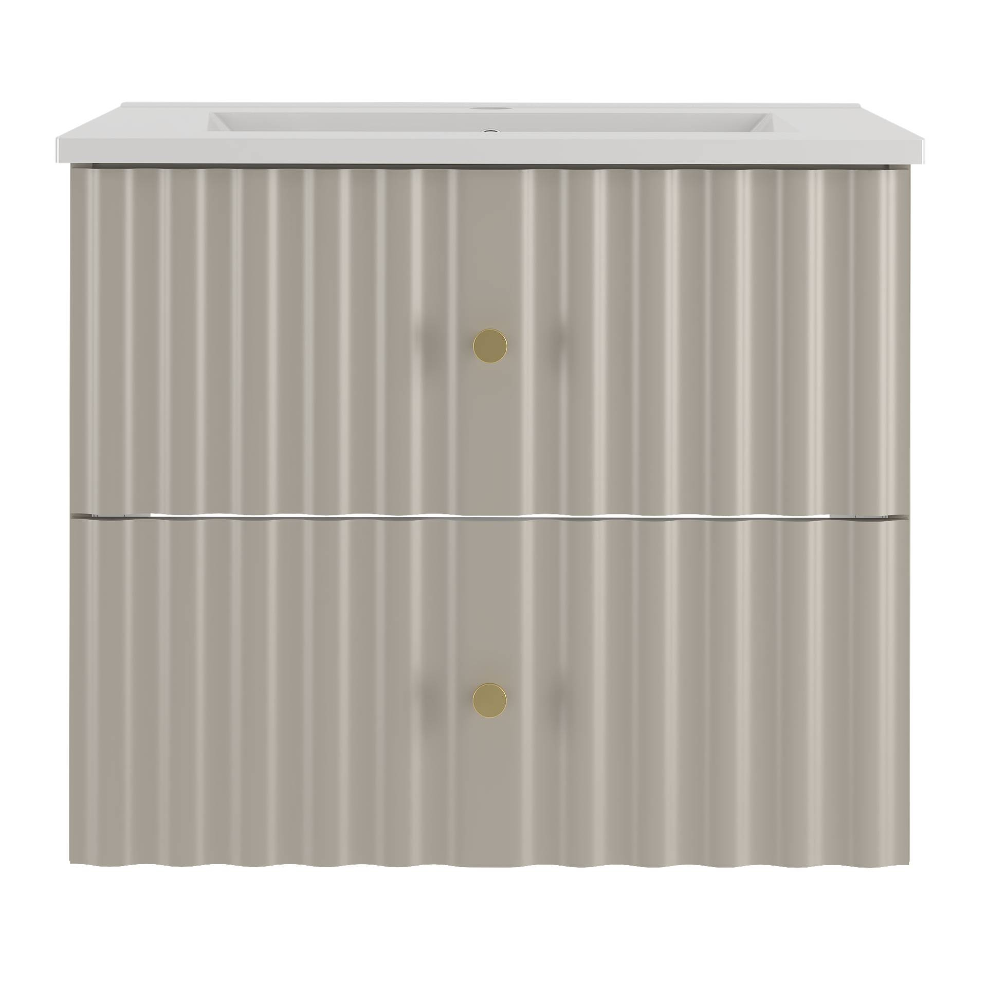 Elegancka szafka z umywalką AQUA-02 o kaszmirowym wykończeniu od marki Megstyl. Front z MDF, korpus z laminowanej płyty, metalowe uchwyty w kolorze szczotkowanego złota. Ceramika sanitarna, cichy domyk zapewniają funkcjonalność i nowoczesny design.