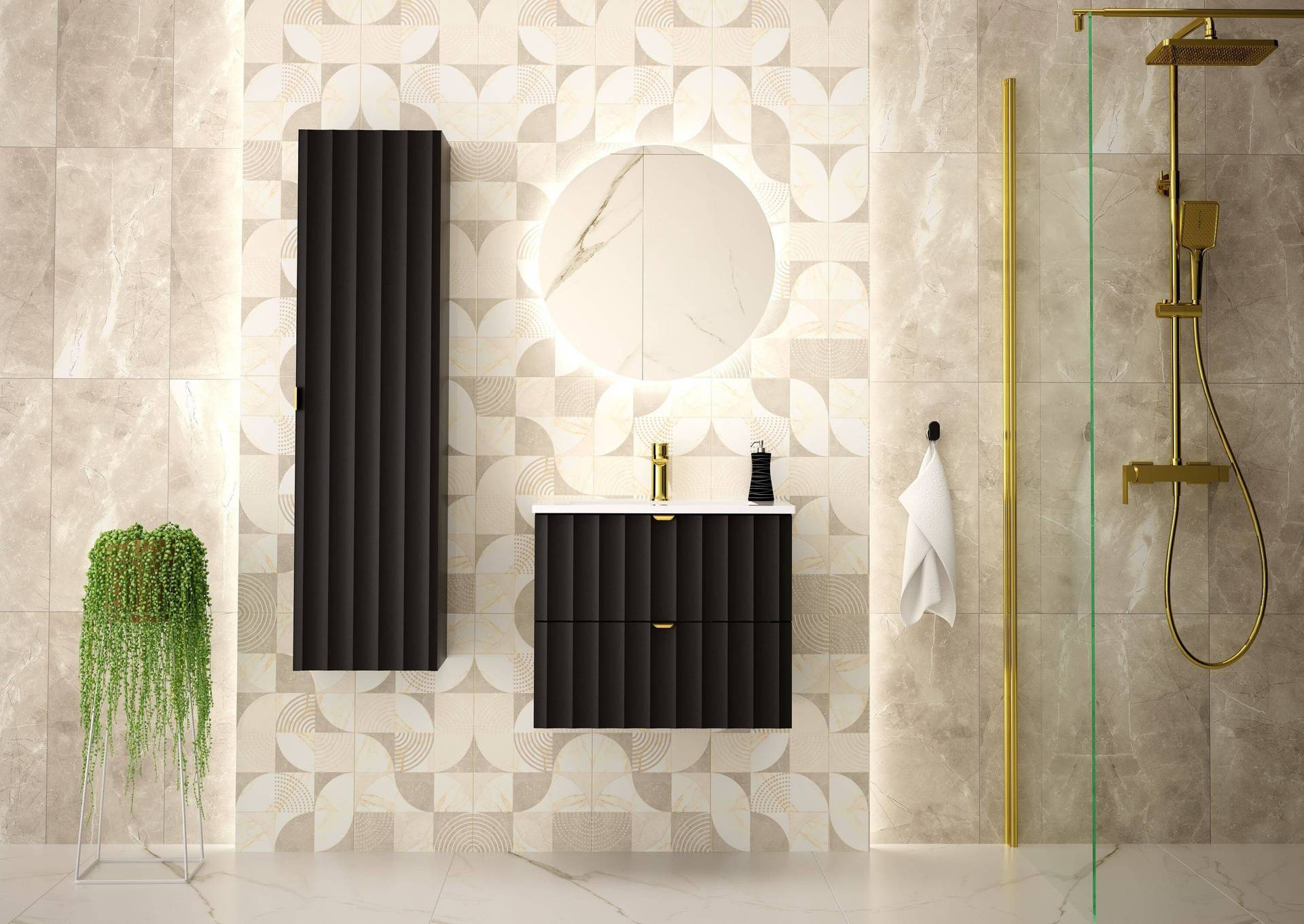 Szafka pod umywalkę ARCOS-06 od Megstyl to elegancka i funkcjonalna wybór do łazienki. Wykonana z czarnej matowej płyty MDF, z metalowymi uchwytami w kolorze szczotkowanego złota. Posiada cichy domyk. Idealna do nowoczesnych wnętrz.