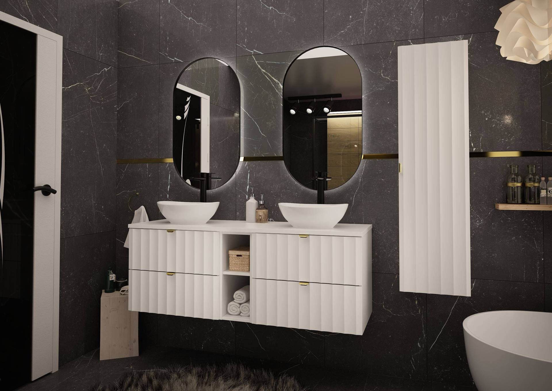 Kolorystyka białego matu sprawia, że zestaw pasuje do szerokiej gamy wnętrz, od domowego spa po minimalistyczne apartamenty. Optycznie powiększa przestrzeń, wprowadzając jasność i świeżość, które są tak pożądane w łazienkach. To idealne rozwiązanie dla osób, które cenią sobie połączenie elegancji z nieprzeciętną >praktycznością<. Pozwól, by ARCOS-06 stał się centralnym punktem Twojego wnętrza, nadając mu unikalny charakter.