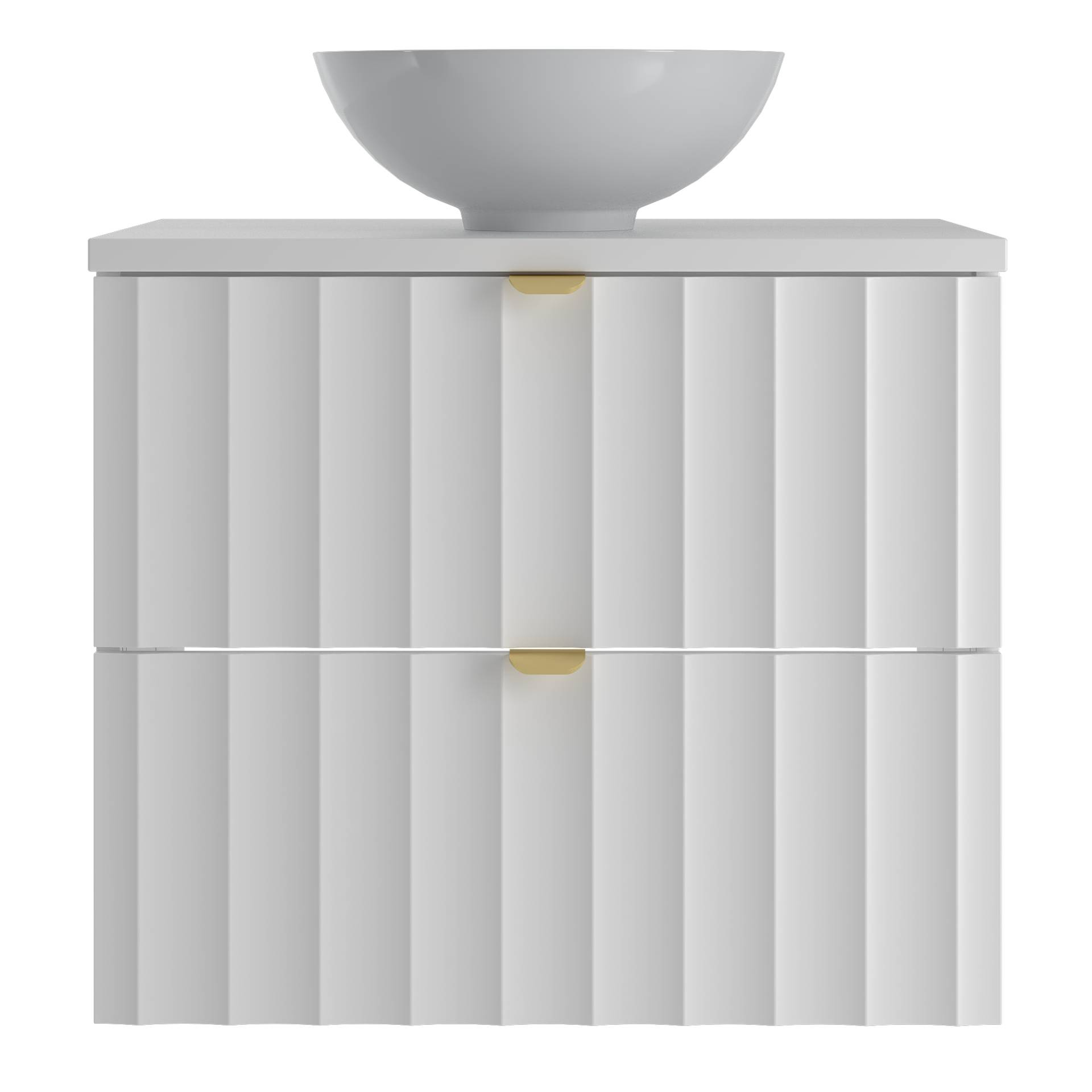 Elegancka szafka ARCO-06 z umywalką nablatową od Megstyl doskonale wpasuje się w nowoczesne wnętrze. Wykonana z płyty MDF w białym macie, z cichym domykiem. Metalowe uchwyty w szczotkowanym złocie dodają klasy. Blat i umywalka z białej ceramiki.