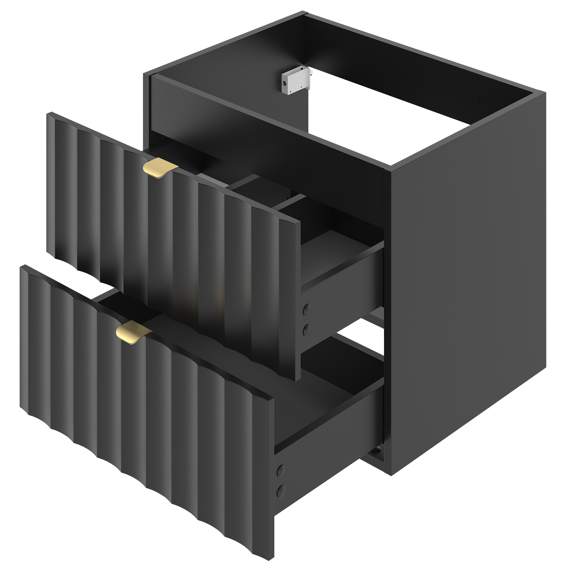 Emanacja czystego stylu i nowoczesnej prostoty, czarny mat na froncie i korpusie zachwyci każdego, kto przekroczy próg Twojej łazienki. Metalowe uchwyty w szczotkowanym złocie dodają prestiżu i wyjątkowości, kontrastując jednocześnie z gładką, białą powierzchnią umywalki z ceramiki sanitarnej. Takie połączenie kolorów tworzy niepowtarzalne wrażenie i sprawia, że mebel staje się bardziej niż tylko funkcjonalnym dodatkiem.
