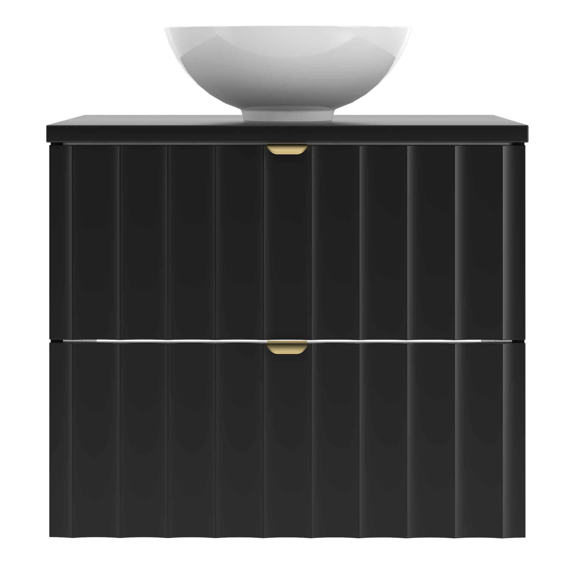 Szafka z umywalką ARCOS-06 to elegancja w czarnym macie. Wykonana z płyty MDF, z metalowymi uchwytami w kolorze szczotkowanego złota. Cichy domyk zapewnia komfort użytkowania. Umywalka nablatowa z ceramiki sanitarnej w białym połysku.