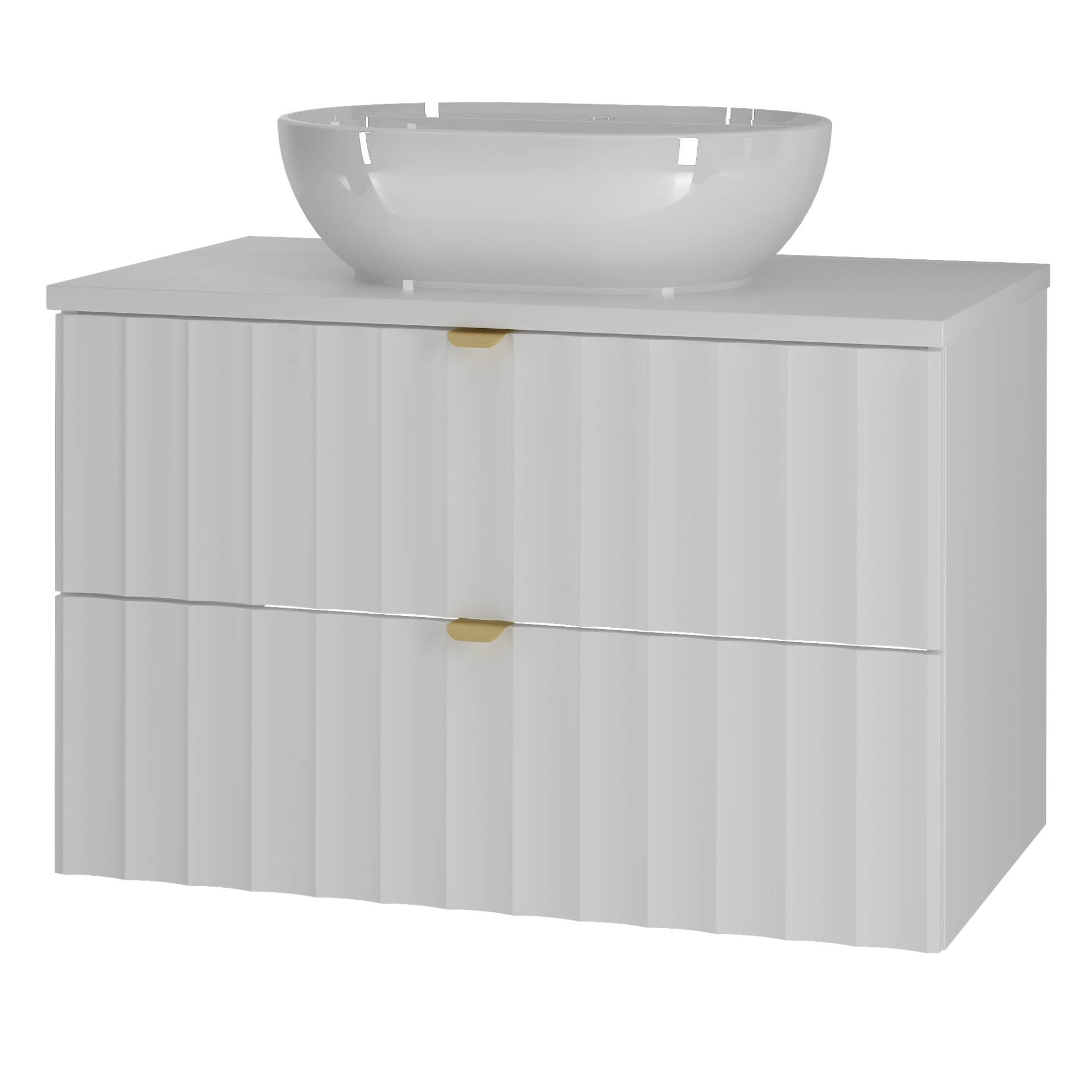 - Szafka z umywalką ARCOS-07 to zestaw o nowoczesnym wyglądzie, idealny do eleganckiej łazienki. Wykonana z płyty MDF i laminatu w białym macie. Umywalka ceramiczna nablatowa. Metalowe uchwyty w kolorze szczotkowanego złota dodają luksusu. Łatwy montaż.