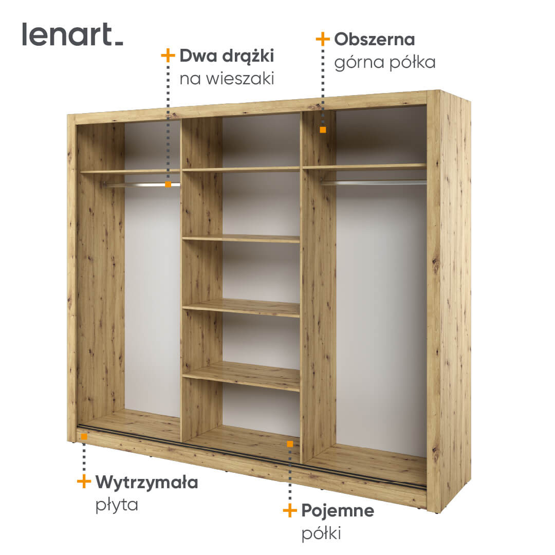 - Funkcjonalna szafa ARTI AR-02 w Dąb Artisan z trzema przesuwnymi drzwiami i lustrami, które rozświetlają wnętrze. Wnętrze wyposażone w drążki i regały - idealna do przechowywania ubrań.