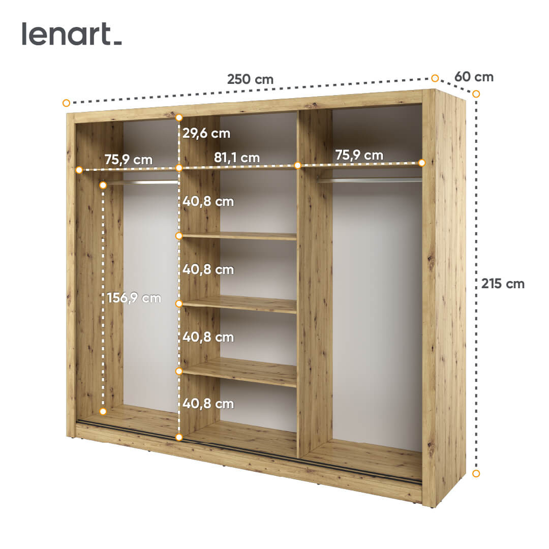 ARTI AR-02 to szafa o szerokości 250 cm, wysokości 215 cm oraz głębokości 60 cm, charakteryzująca się 3D bryłą, co oznacza, że jej nowoczesny design został podkreślony trzema przesuwnymi drzwiami z lustrami, które nie tylko są praktyczne, ale również optycznie powiększają i rozjaśniają pomieszczenie. Lustra dostępne w zestawie mają białą barwę i są wykonywane z solidnego szkła o grubości 3 mm, zapewniając czysty oraz wyraźny obraz.