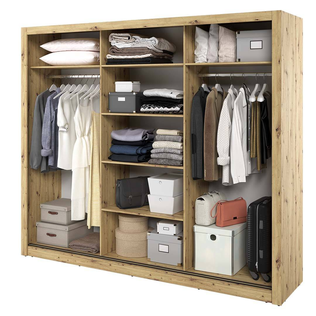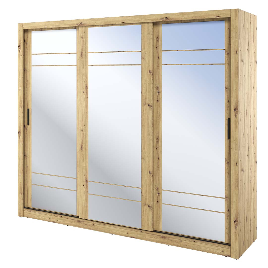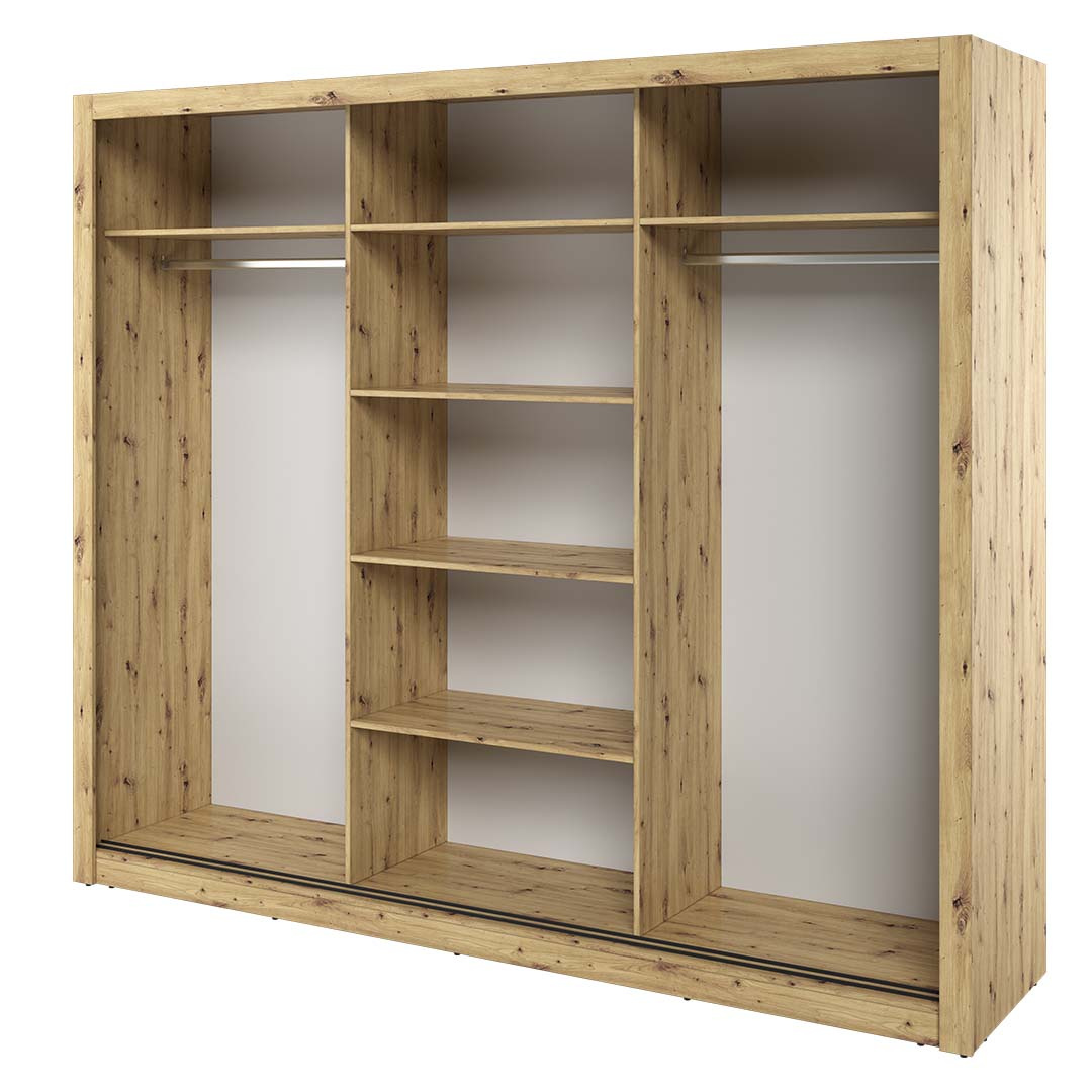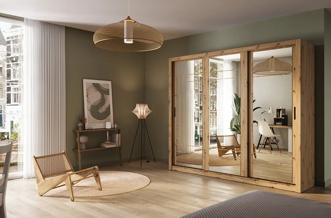 Funkcjonalna szafa ARTI AR-02 w Dąb Artisan z trzema przesuwnymi drzwiami i lustrami, które rozświetlają wnętrze. Wnętrze wyposażone w drążki i regały - idealna do przechowywania ubrań.