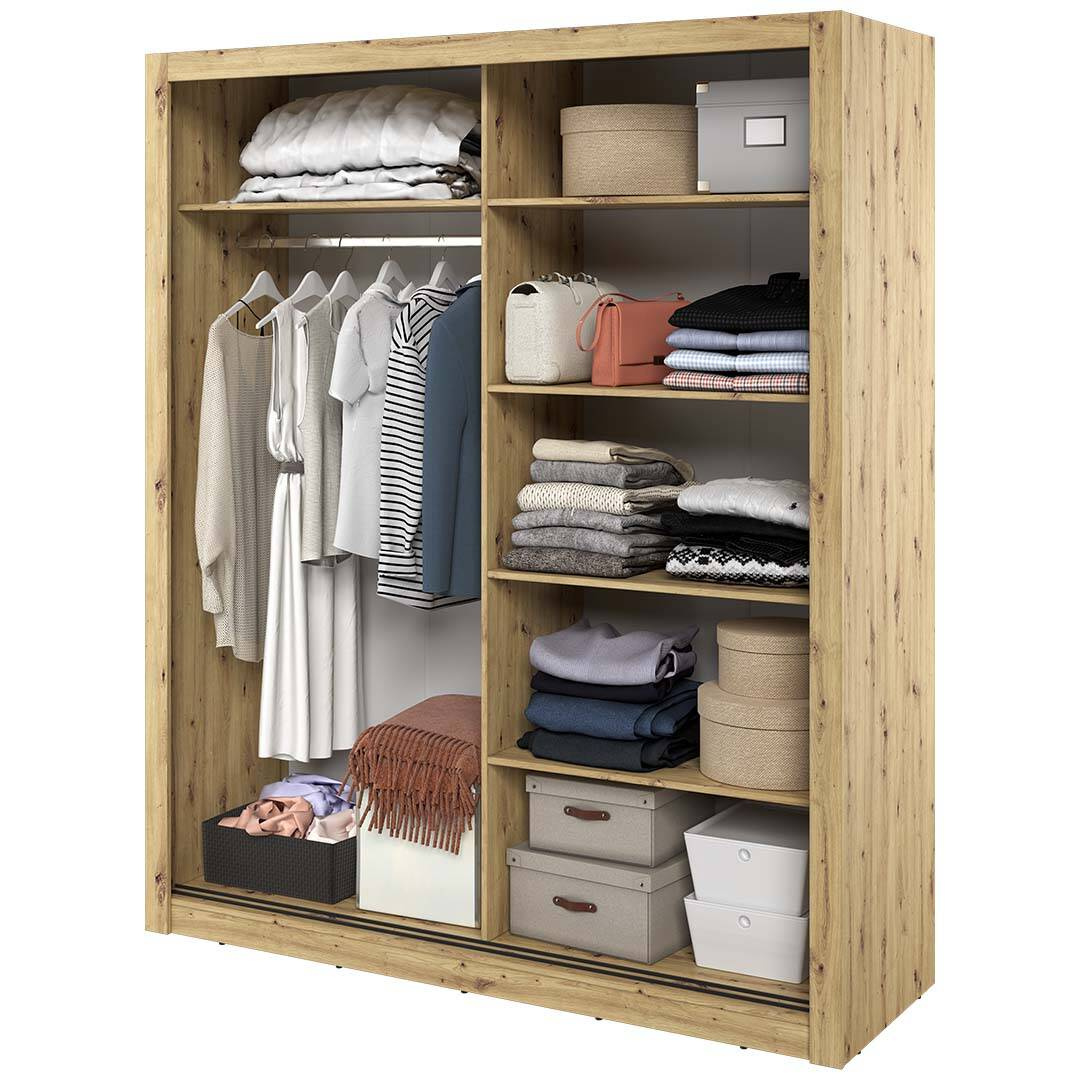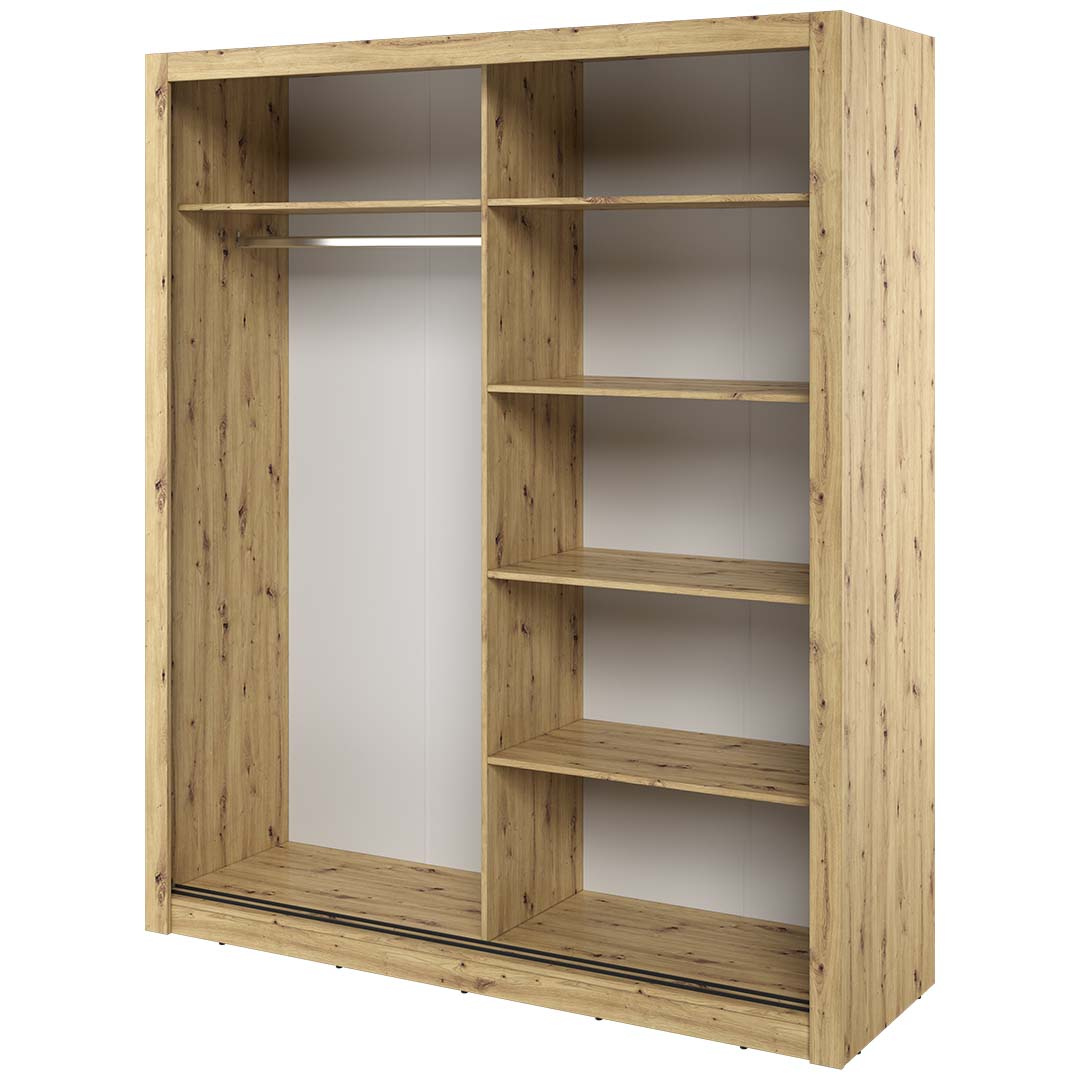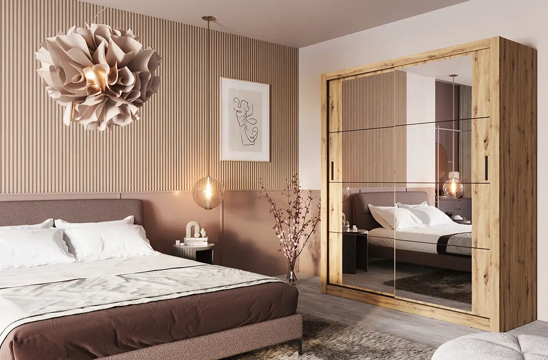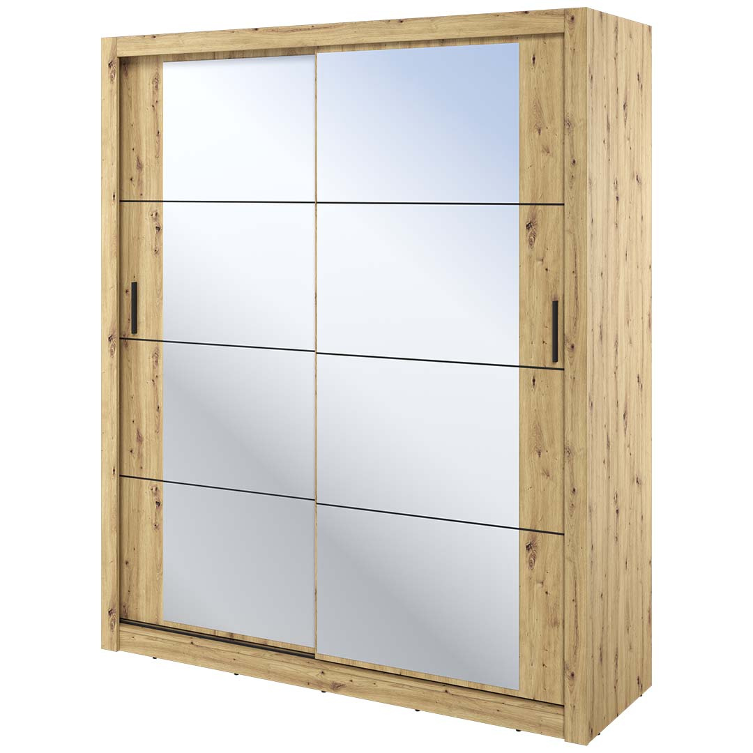 - Szafa ARTI AR-03 w kolorze Dąb Artisan, z lustrami na przesuwnych drzwiach, które optycznie powiększają pomieszczenie. Praktyczna, z 2 drążkami i 5 półkami, idealna do każdego wnętrza.