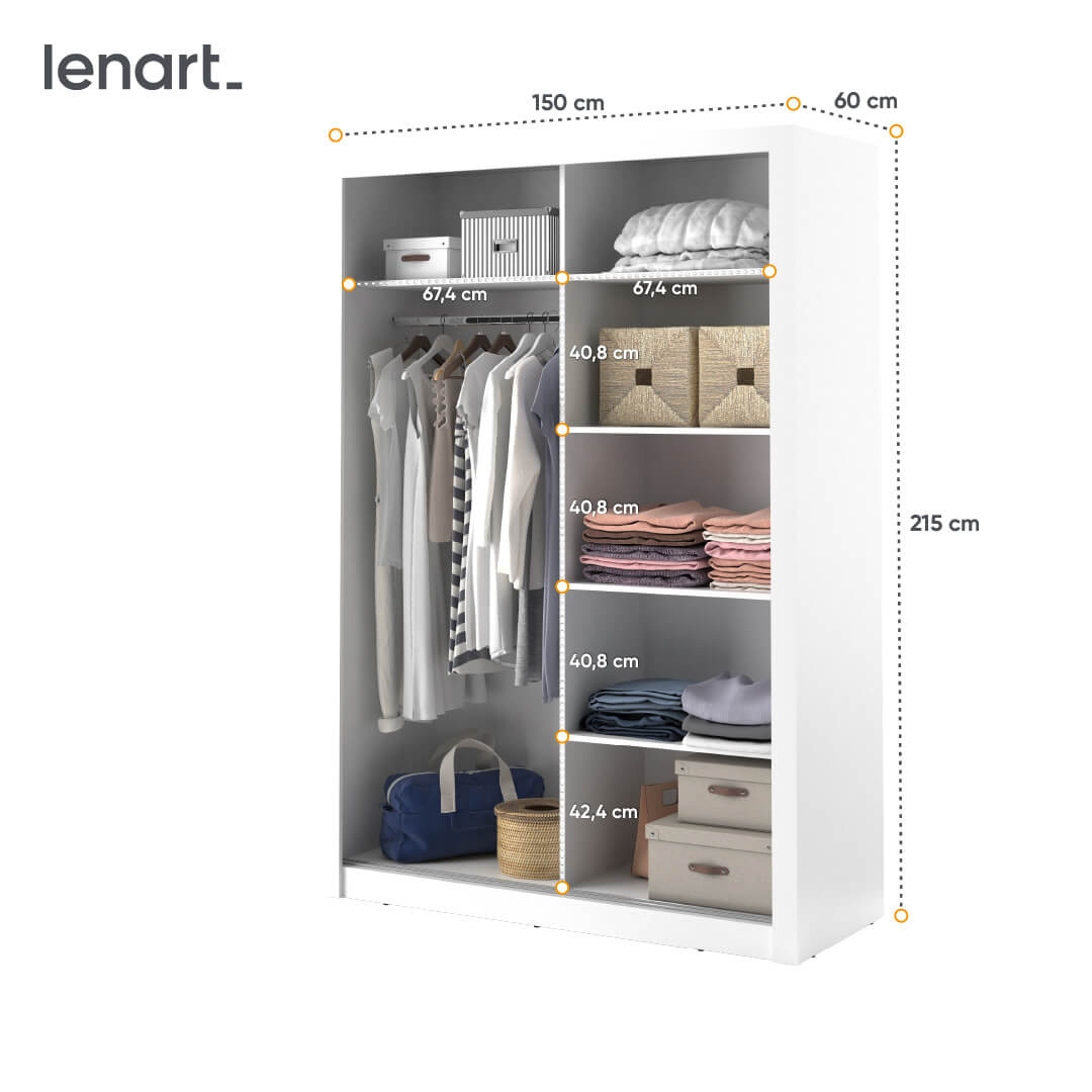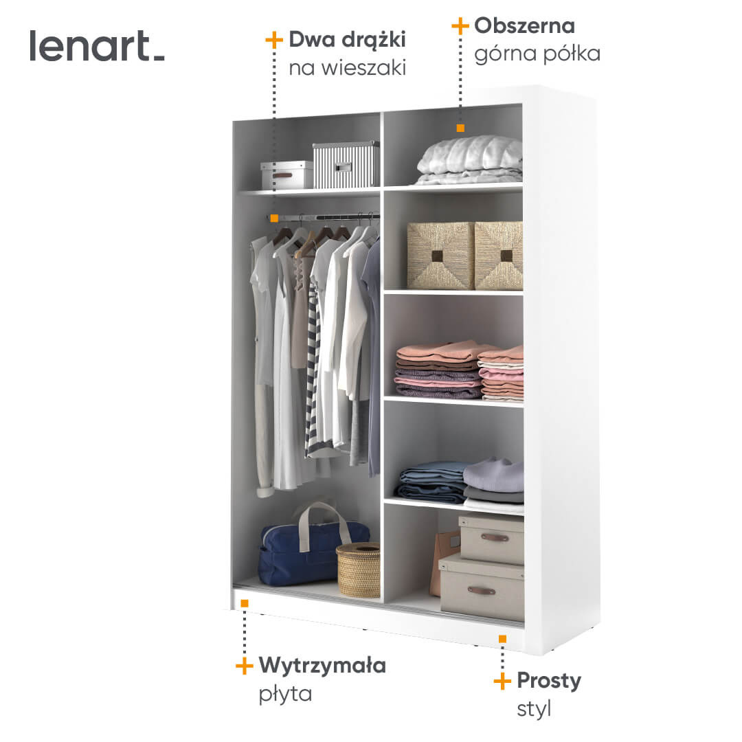Design szafy, nawiązujący do nowoczesnego stylu, cechuje się minimalizmem i funkcjonalnością. Dwie przesuwne drzwi, które przesuwają się gładko na aluminiowych prowadnicach, sprawią, że łatwo dostosujesz układ mebla do potrzeb własnego wnętrza. Dodatkowym atutem jest możliwość zamontowania stylowego oświetlenia LED, które podkreśli elegancję szafy oraz pomoże wygodnie wybrać ubrania, nawet w słabiej oświetlonym pokoju.