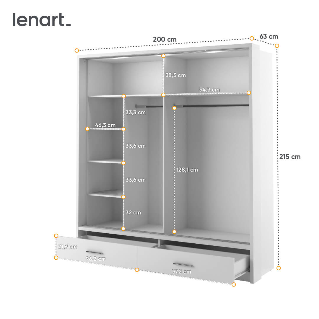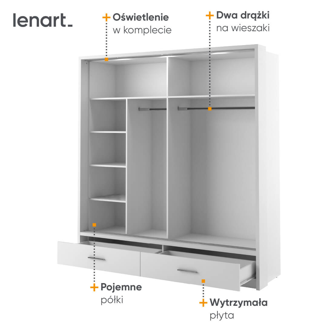 Głównym punktem zalet tego mebla są przesuwne drzwi oraz dwie szuflady znajdujące się na dole. Prowadnice drzwiowe wykonane z aluminium oraz rolkowe prowadnice szuflad, zapewniają łatwą i bezawaryjną obsługę na co dzień. Przesuwne drzwi zaoszczędzą miejsce w Twojej sypialni, pozwalając na wygodne otwieranie i zamykanie szafy bez potrzeby zostawiania dodatkowej przestrzeni na klasyczne drzwi.
