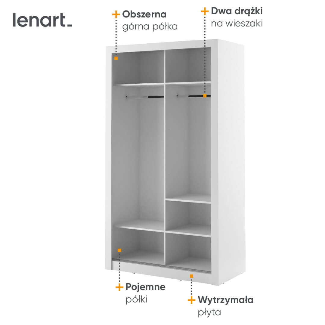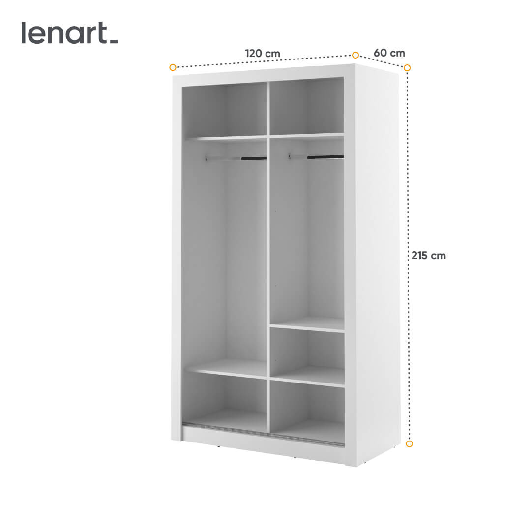Jej szerokość 120 cm, wysokość 215 cm oraz głębokość 60 cm to idealne wymiary do sypialni, garderoby czy nawet do eleganckiego przedpokoju. Dwudrzwiowy design z opcjonalnym lustrzanym frontem optycznie powiększy pomieszczenie, a dodatkowe wyposażenie w postaci 2 drążków i 5 półek umożliwia efektywną organizację przestrzeni.