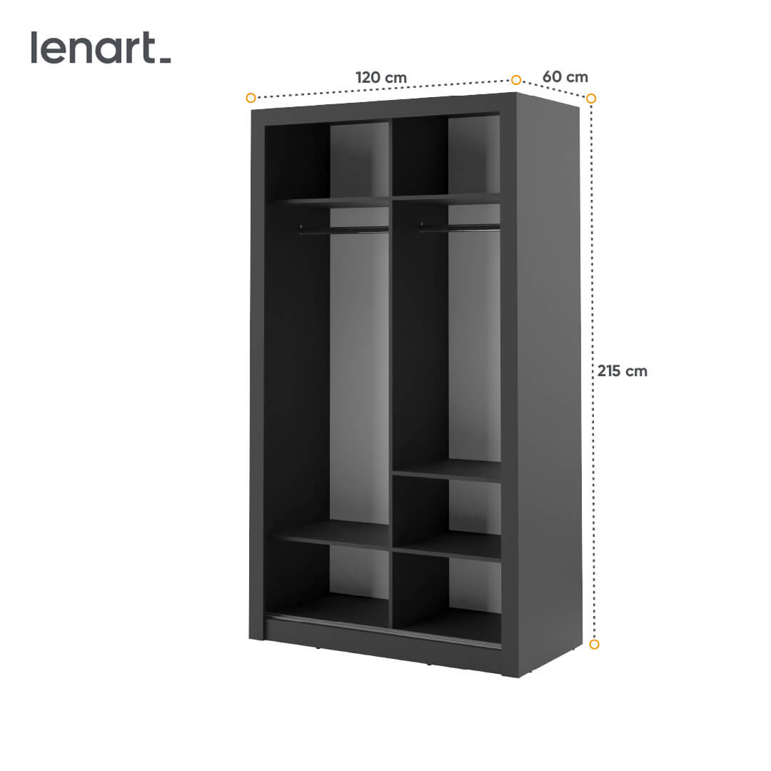 Idealna do niewielkich wnętrz, szafa ARTI AR-06 z lustrem o szerokości 120 cm i efektownym czarnym wykończeniem. Oferuje bogate wnętrze z drążkami i półkami, a lustrzane drzwi optycznie powiększają przestrzeń.