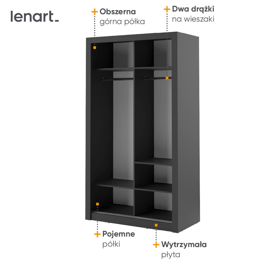 - Idealna do niewielkich wnętrz, szafa ARTI AR-06 z lustrem o szerokości 120 cm i efektownym czarnym wykończeniem. Oferuje bogate wnętrze z drążkami i półkami, a lustrzane drzwi optycznie powiększają przestrzeń.
