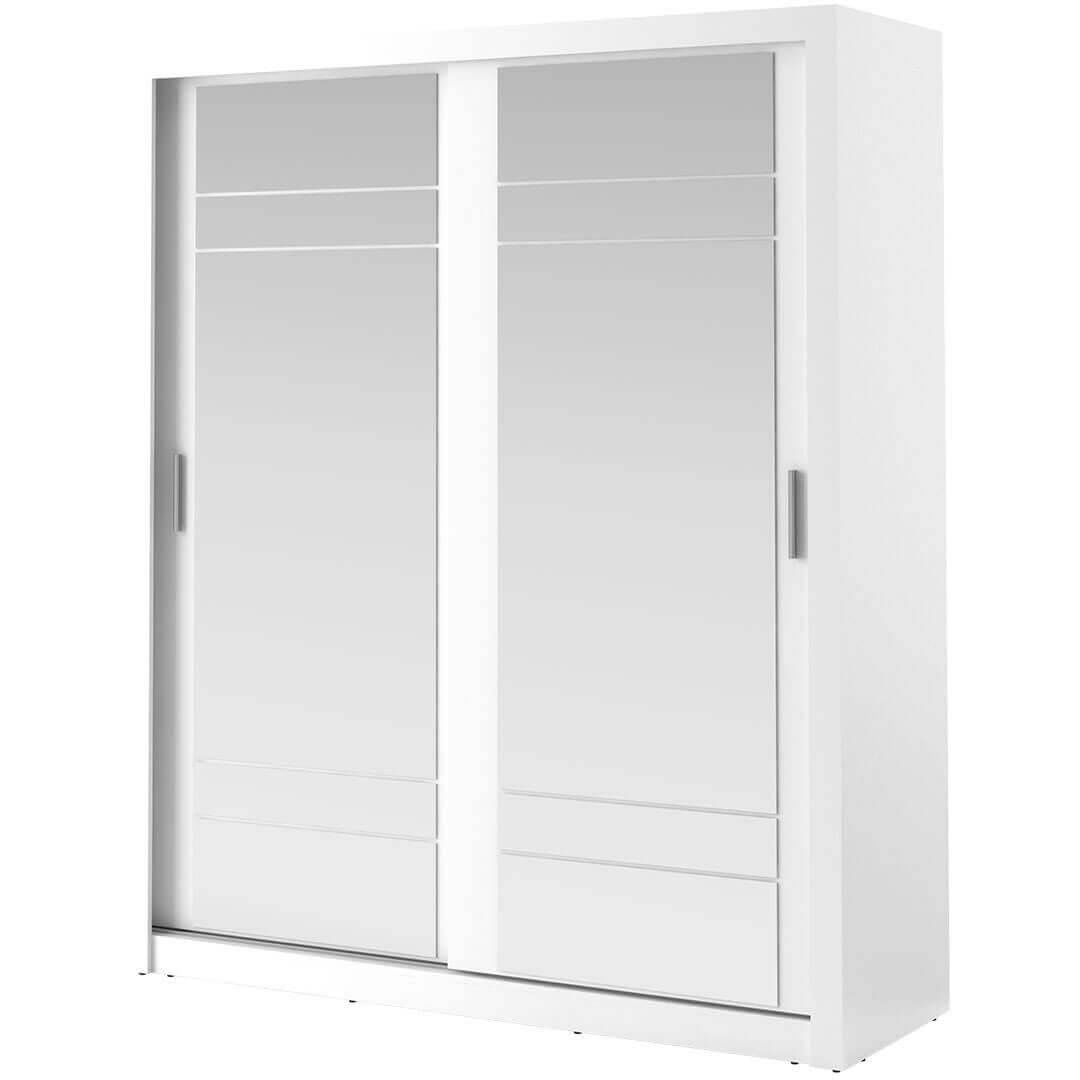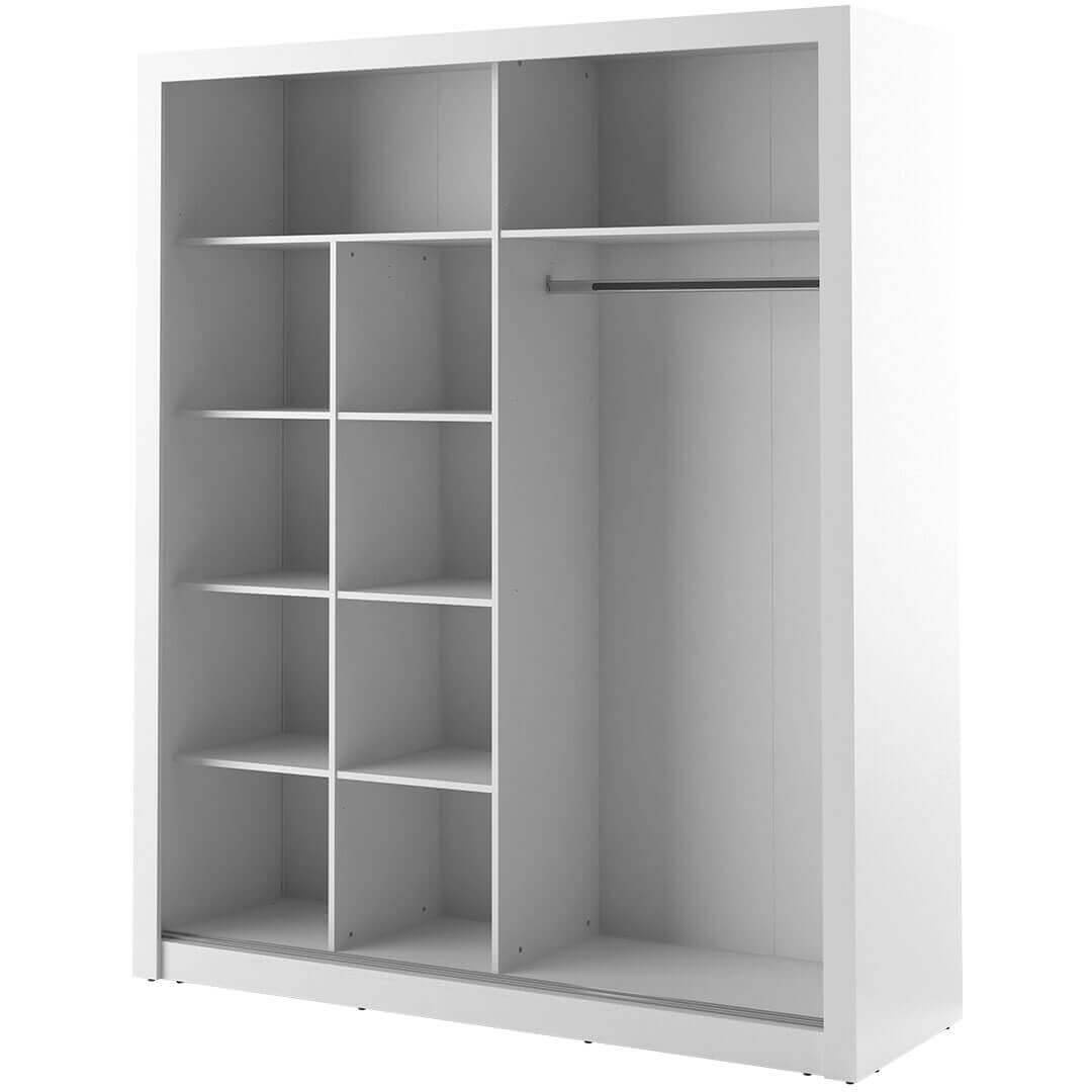 Funkcjonalna szafa ARTI AR-08, białe wykończenie, z przesuwnymi drzwiami i lustrami. Oszczędza przestrzeń, zwiększa wizualnie wnętrze, wyposażona w praktyczne półki i drążek.