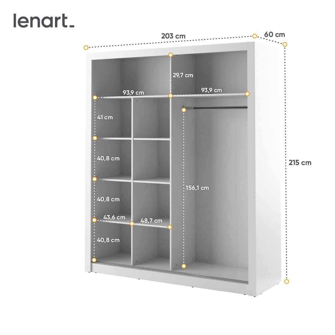 Model AR-08 prezentuje wymiary (szerokość: 203 cm, wysokość: 215 cm, głębokość: 60 cm) gwarantujące maksymalne wykorzystanie dostępnego miejsca. Solidna konstrukcja o wadze 213 kg, wykonana została z płyty wiórowej laminowanej o grubości 16mm, z wykończeniem krawędziowanie ABS o szerokości 0,45mm, zapewniającemu trwałość na lata użytkowania. Ta imponująca szafa wymaga montażu, który dzięki dołączonej instrukcji i okuciom (znajdującym się w paczce nr 3) stanie się prostym zadaniem.