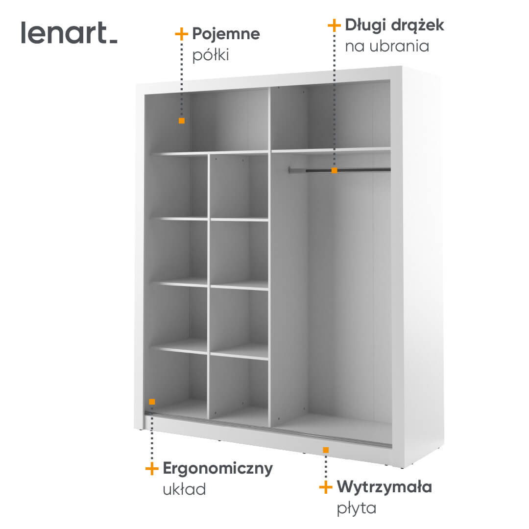 Lustrzane fronty pomagają wizualnie powiększyć przestrzeń oraz wprowadzają dodatkowe światło do pomieszczenia, co jest szczególnie cenione w mniejszych sypialniach lub przedpokojach. Dostępna opcja oświetlenia LED (klasa energetyczna A++) pozwoli na stworzenie niepowtarzalnej atmosfery i ułatwi wybór garderoby.