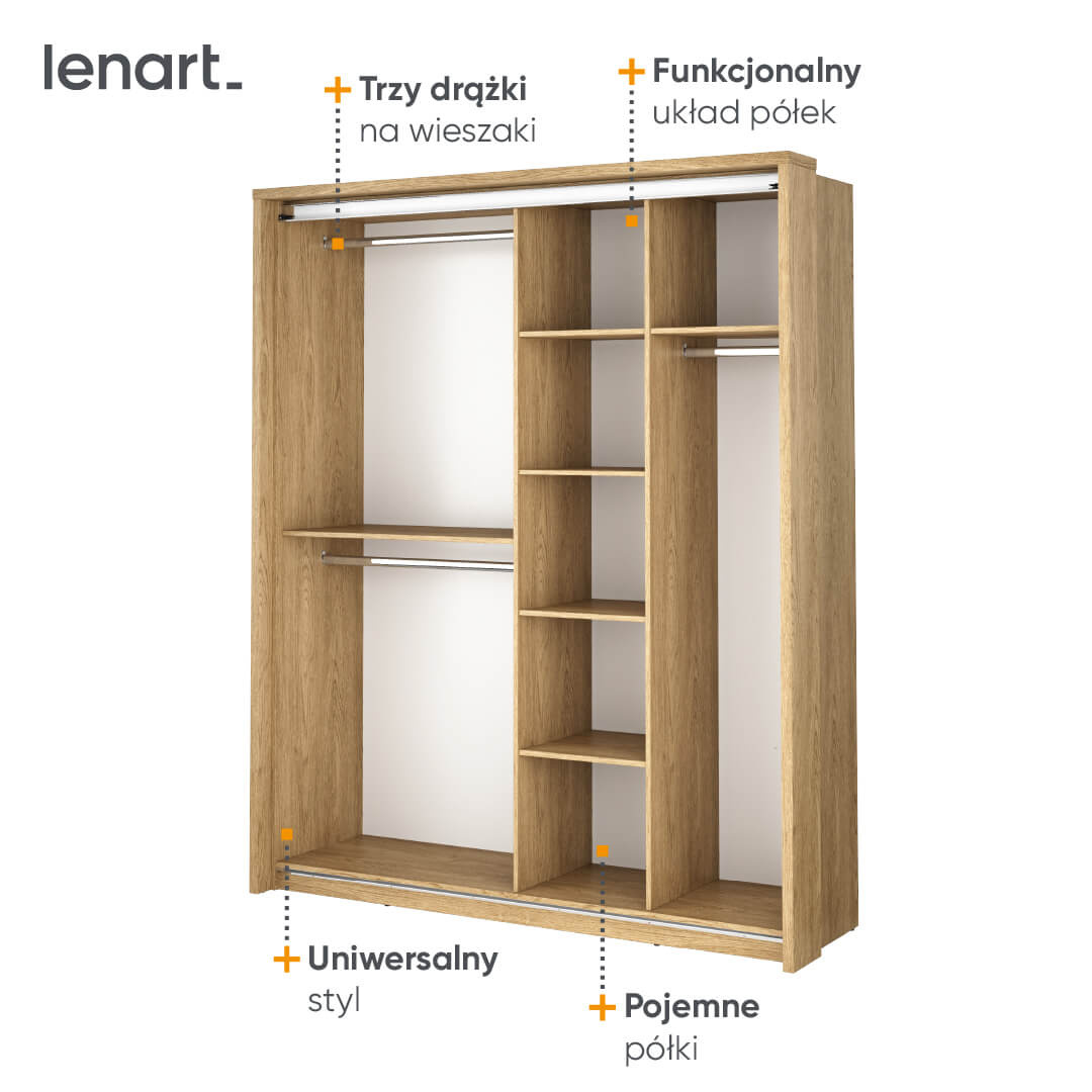 - Szafa ARTI AR-17 w odcieniu dębu shetland z lustrami optycznie powiększającymi przestrzeń. Przesuwne drzwi, 3 drążki i 5 półek zapewniają funkcjonalną organizację ubrań.
